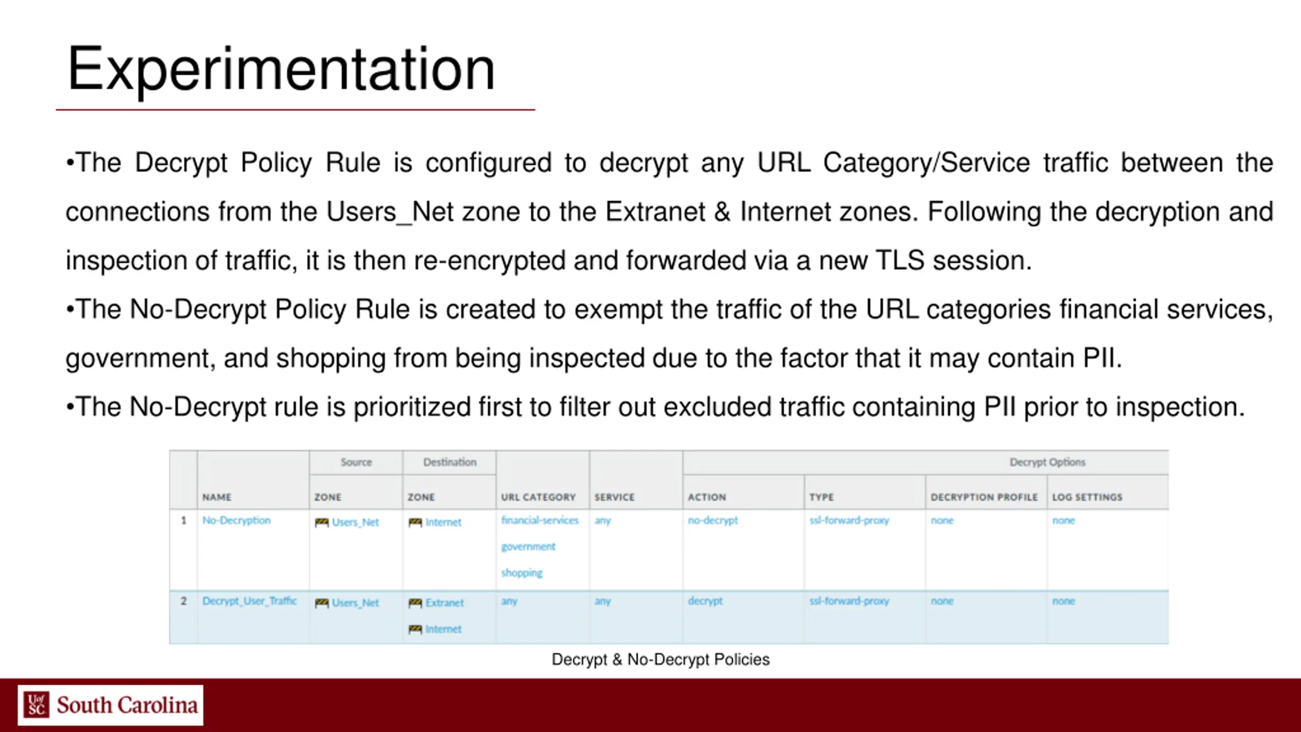 Experimentation The Decrypt Policy Rule is configured to decrypt any URL Category/Service traffic between the connections from the Users_Net zone to the Extranet & Internet zones. Following the decryption and inspection of traffic, it is then re-encrypted and forwarded via a new TLS session. The No-Decrypt Policy Rule is created to exempt the traffic of the URL categories financial services, government, and shopping from being inspected due to the factor that it may contain PII. The No-Decrypt rule is prioritized first to filter out excluded traffic containing PII prior to inspection. Decrypt & No-Decrypt Policies 7