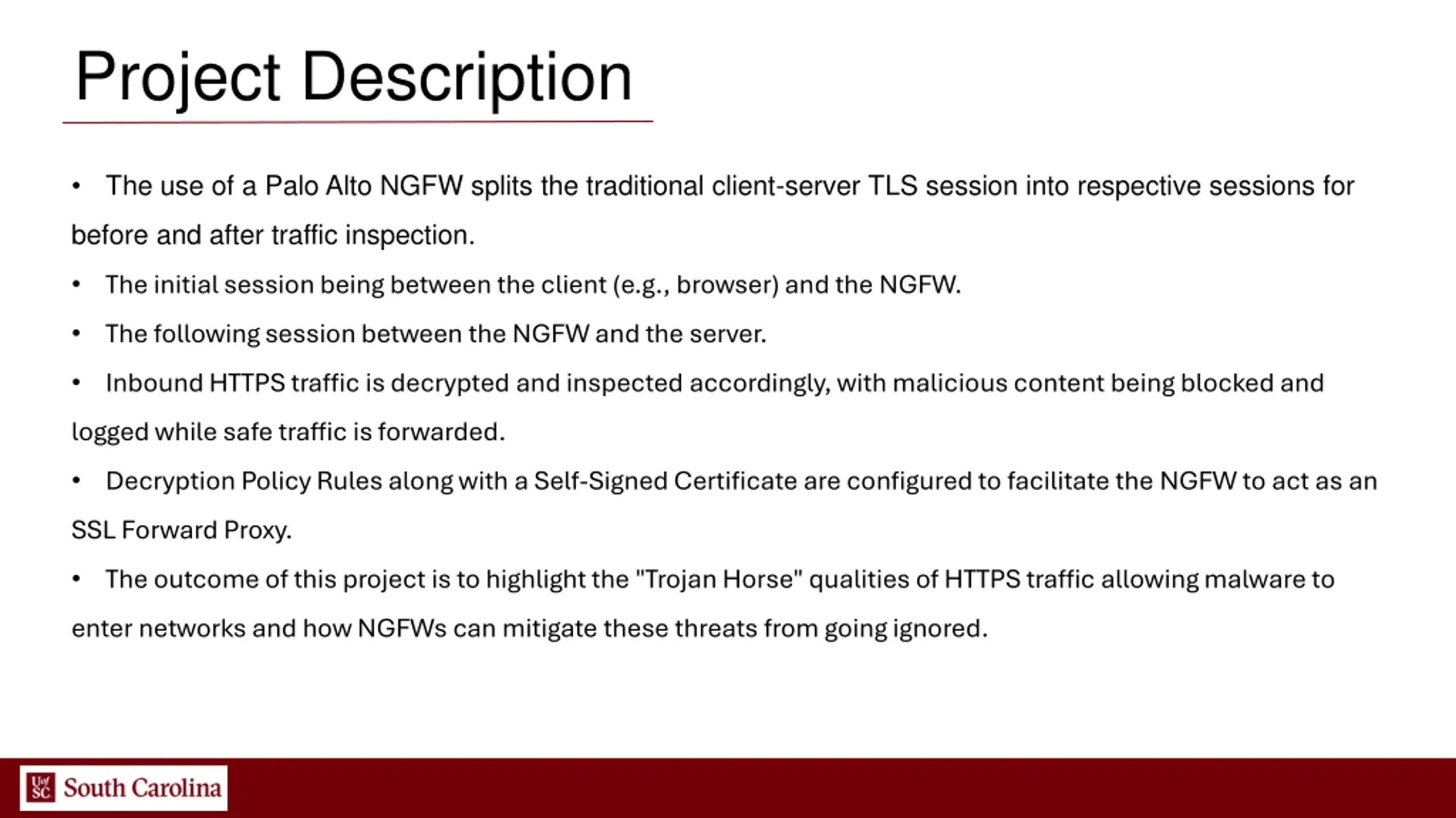 Project Description The use of a Palo Alto NGFW splits the traditional client-server TLS session into respective sessions for before and after traffic inspection. The initial session being between the client (e.g., browser) and the NGFW. The following session between the NGFW and the server. Inbound HTTPS traffic is decrypted and inspected accordingly, with malicious content being blocked and logged while safe traffic is forwarded. Decryption Policy Rules along with a Self-Signed Certificate are configured to facilitate the NGFW to act as an SSLForward Proxy. The outcome of this project is to highlight the "Trojan Horse" qualities of HTTPS traffic allowing malware to enter networks and how NGFWs can mitigate these threats from going ignored. 4