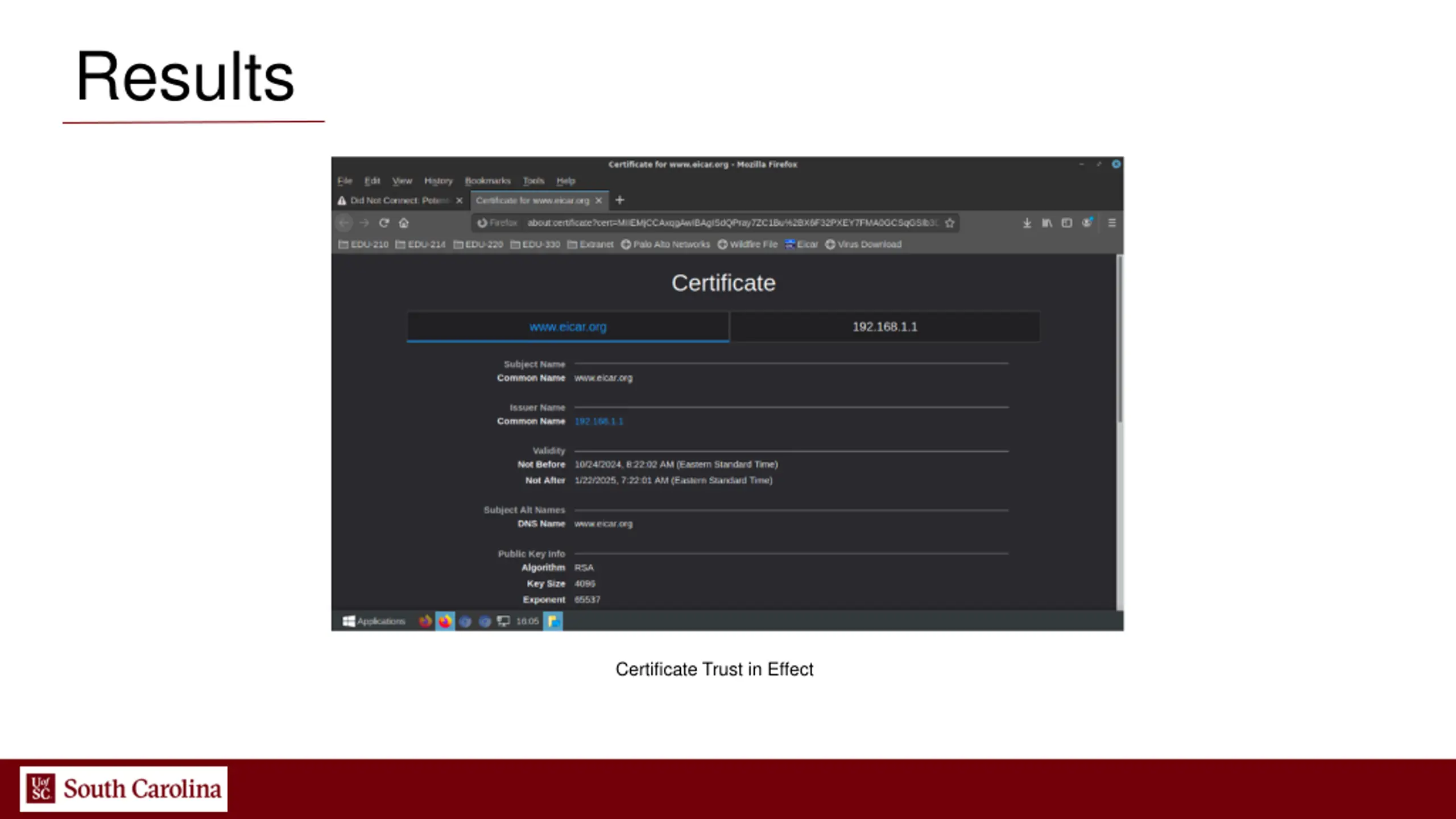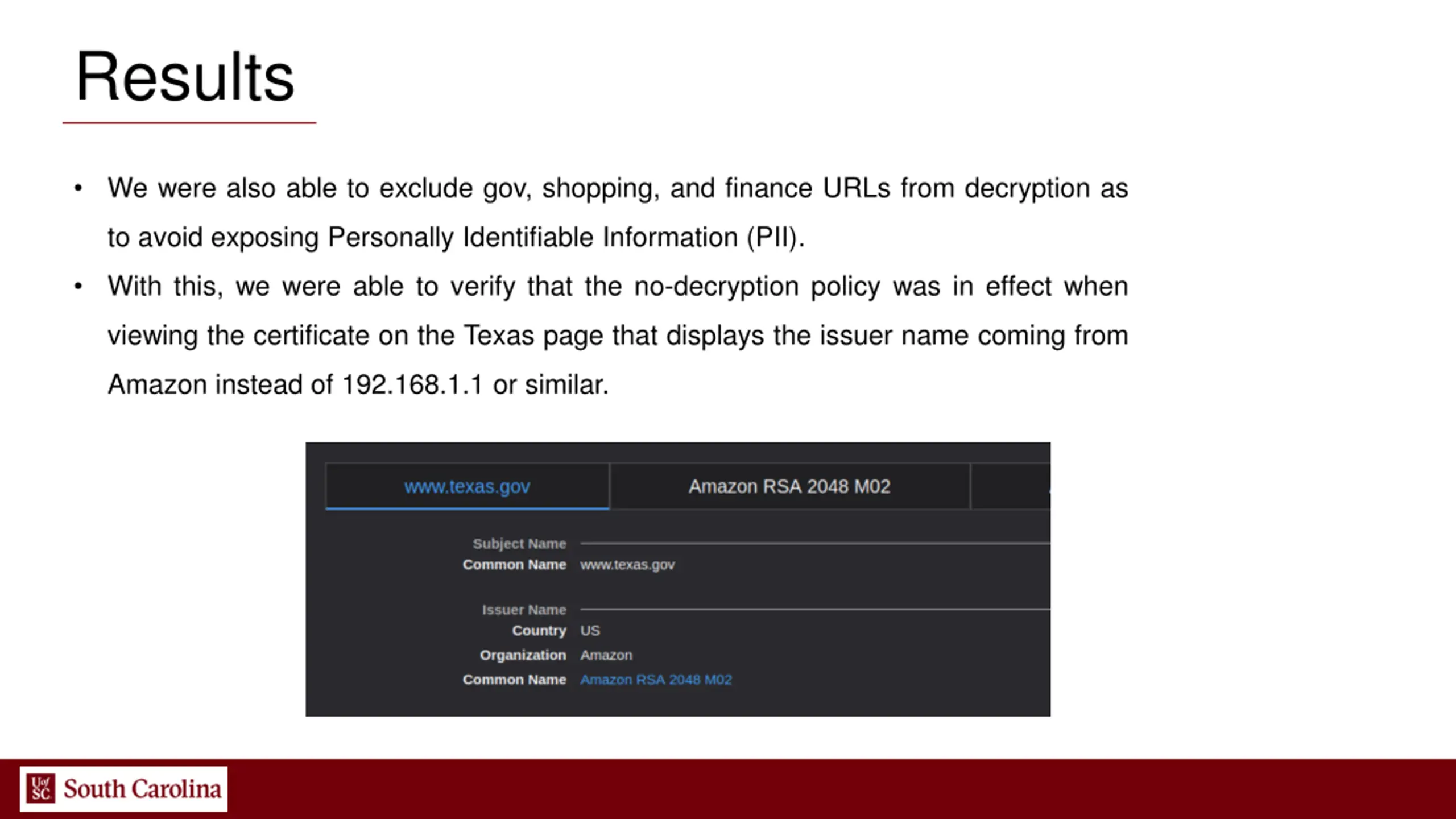 Results We were also able to exclude gov, shopping, and finance URLs from decryption as to avoid exposing Personally Identifiable Information (PII). With this, we were able to verify that the no-decryption policy was in effect when viewing the certificate on the Texas page that displays the issuer name coming from Amazon instead of 192.168.1.1 or similar. 13