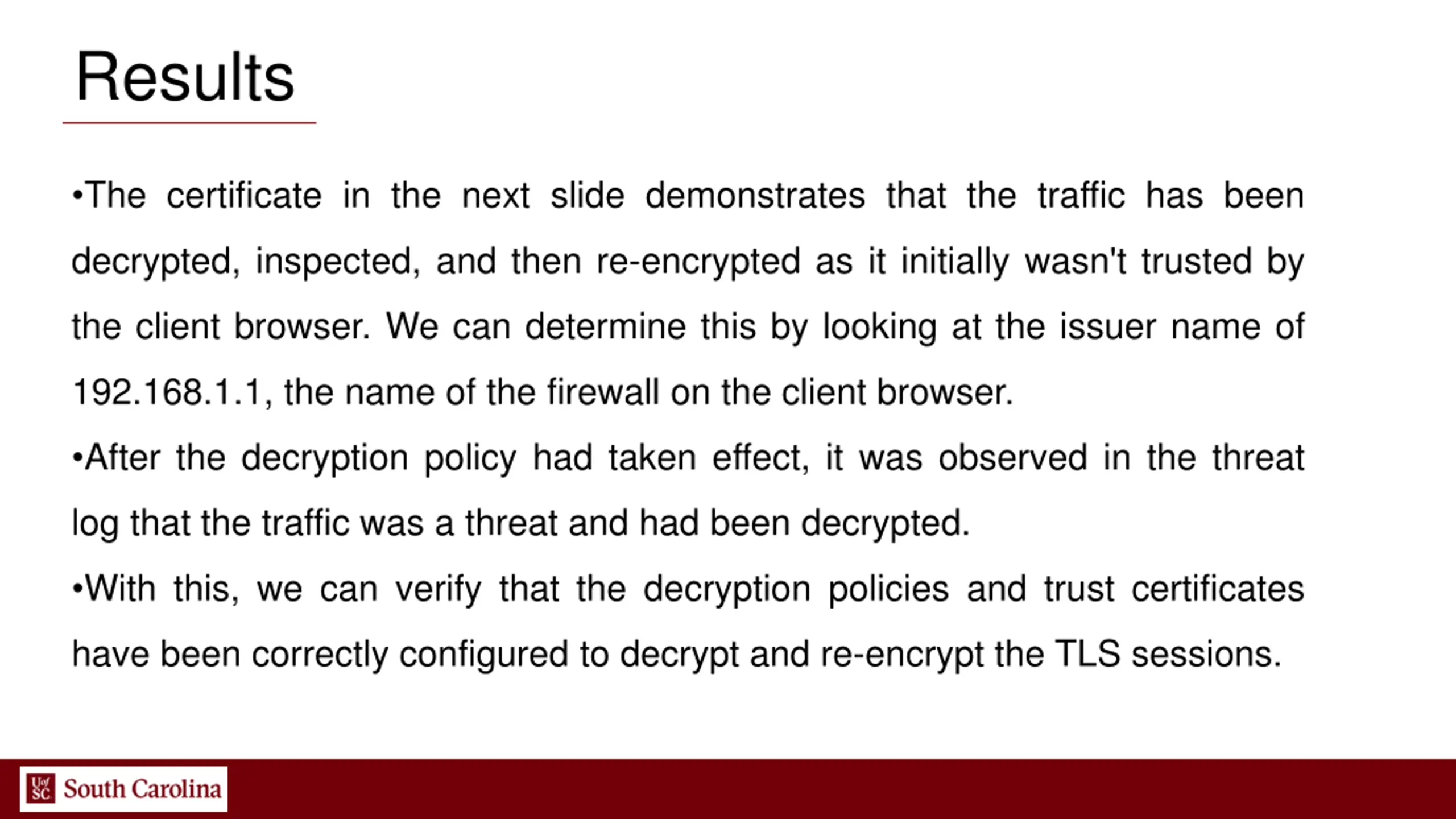 Results The certificate in the next slide demonstrates that the traffic has been decrypted, inspected, and then re-encrypted as it initially wasn't trusted by the client browser. We can determine this by looking at the issuer name of 192.168.1.1, the name of the firewall on the client browser. After the decryption policy had taken effect, it was observed in the threat log that the traffic was a threat and had been decrypted. With this, we can verify that the decryption policies and trust certificates have been correctly configured to decrypt and re-encrypt the TLS sessions. 10