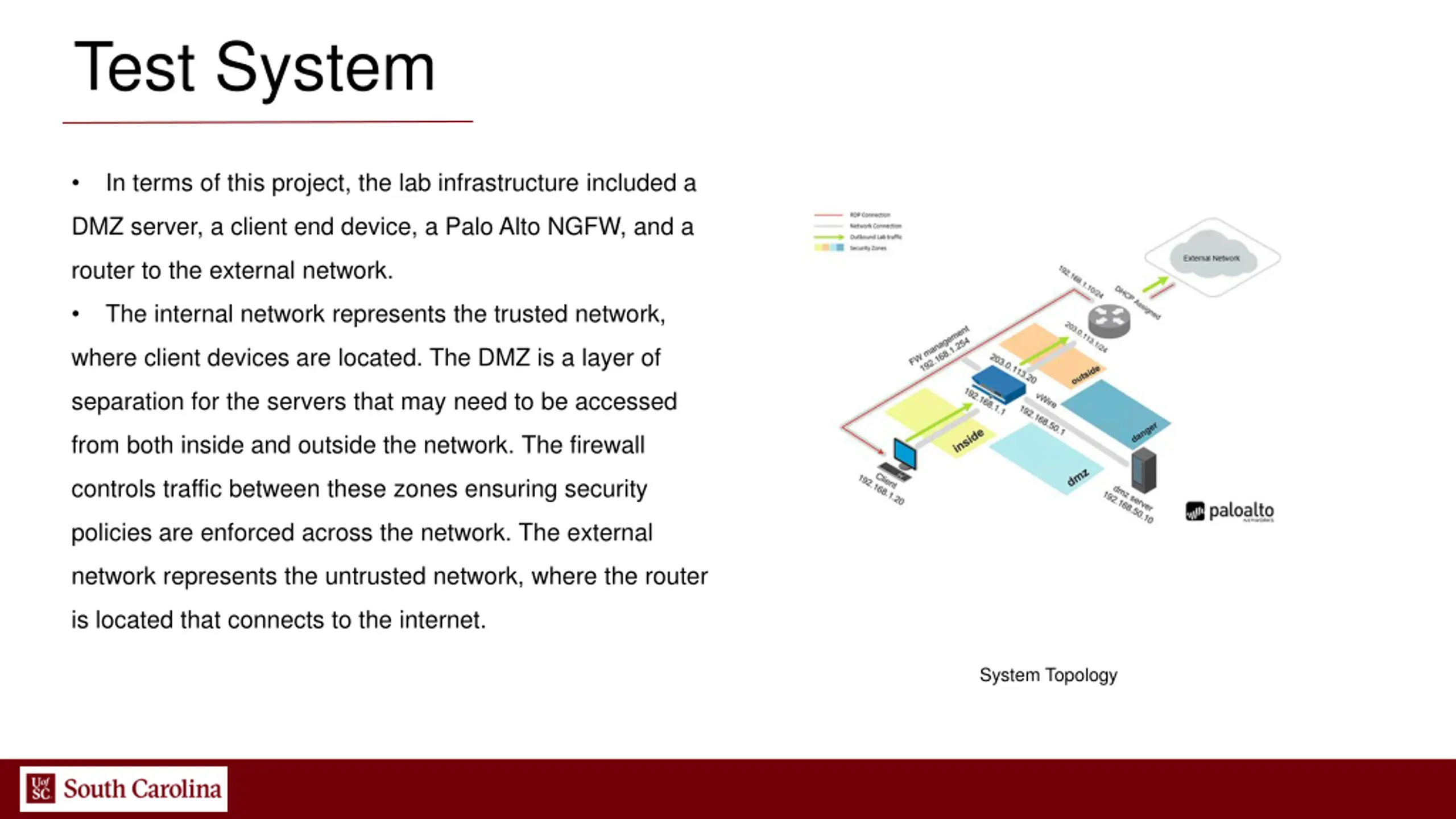 Test System In terms of this project, the lab infrastructure included a DMZ server, a client end device, a Palo Alto NGFW, and a router to the external network. The internal network represents the trusted network, where client devices are located. The DMZ is a layer of separation for the servers that may need to be accessed from both inside and outside the network. The firewall controls traffic between these zones ensuring security policies are enforced across the network. The external network represents the untrusted network, where the router is located that connects to the internet. System Topology 6