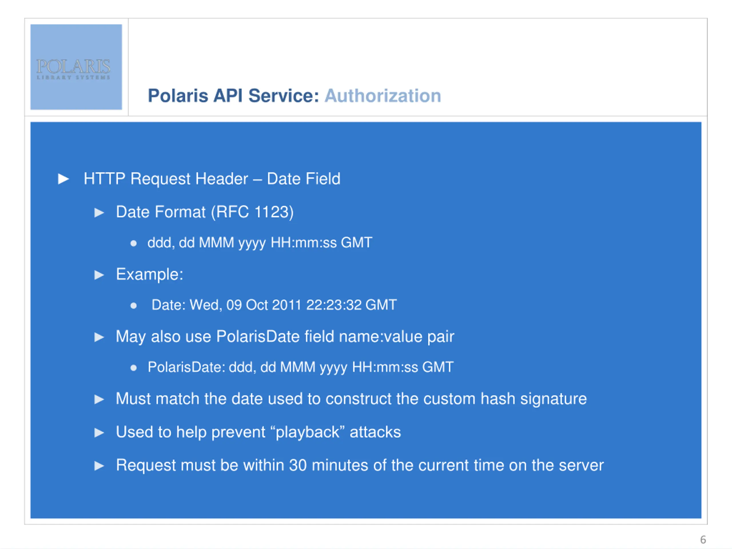 Polaris API Service: Authorization Enter slide title here HTTP Request Header Date Field Enter bullet text here Second level Third level ddd, dd MMM yyyy HH:mm:ss GMT Date Format (RFC 1123) Example: Date: Wed, 09 Oct 2011 22:23:32 GMT May also use PolarisDate field name:value pair PolarisDate: ddd, dd MMM yyyy HH:mm:ss GMT Must match the date used to construct the custom hash signature Used to help prevent playback attacks Request must be within 30 minutes of the current time on the server 6