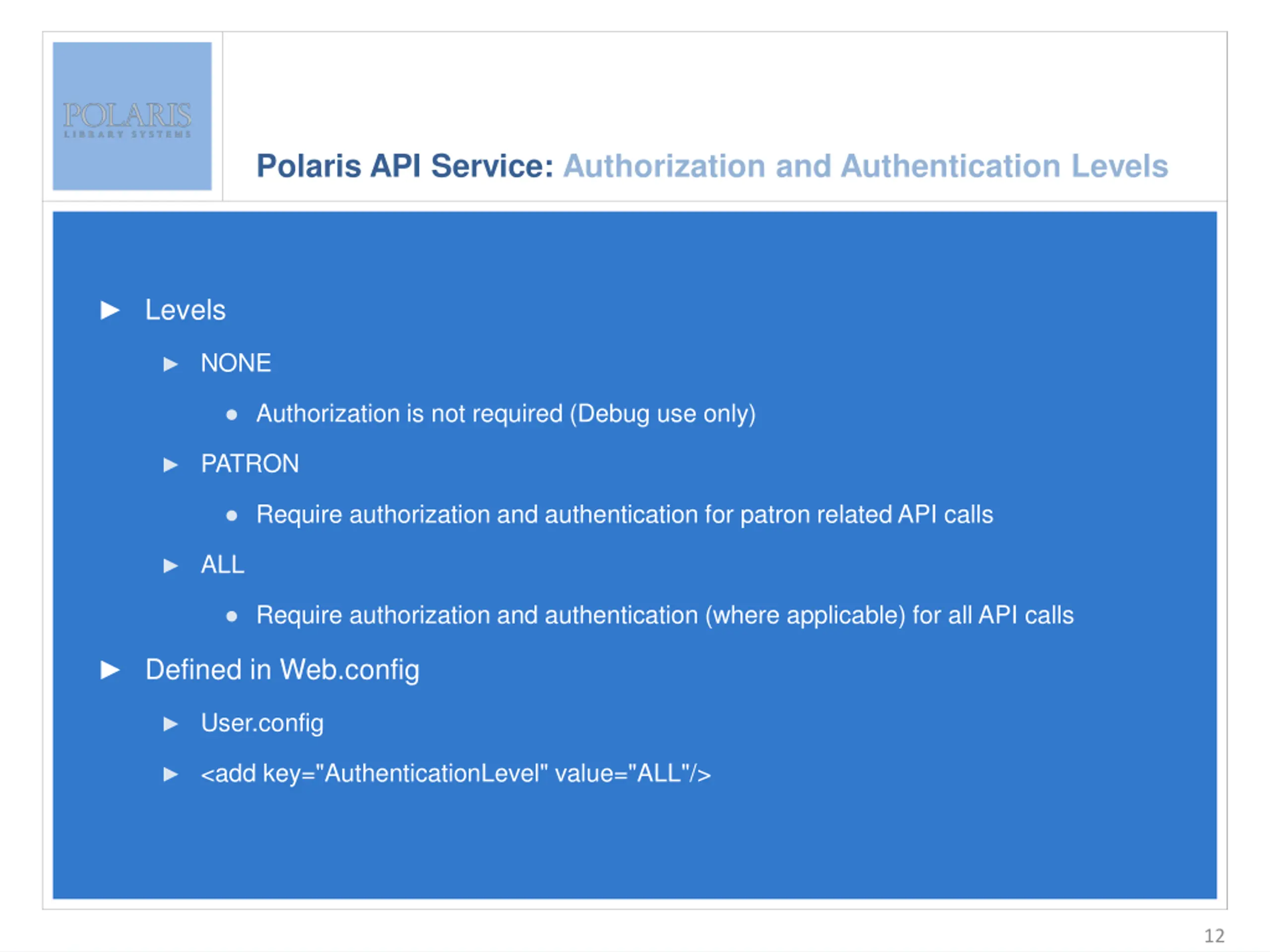 Polaris API Service: Authorization and Authentication Levels Enter slide title here Levels Enter bullet text here Second level Third level Authorization is not required (Debug use only) NONE PATRON Require authorization and authentication for patron related API calls ALL Require authorization and authentication (where applicable) for all API calls Defined in Web.config User.config <add key="AuthenticationLevel" value="ALL"/> 12