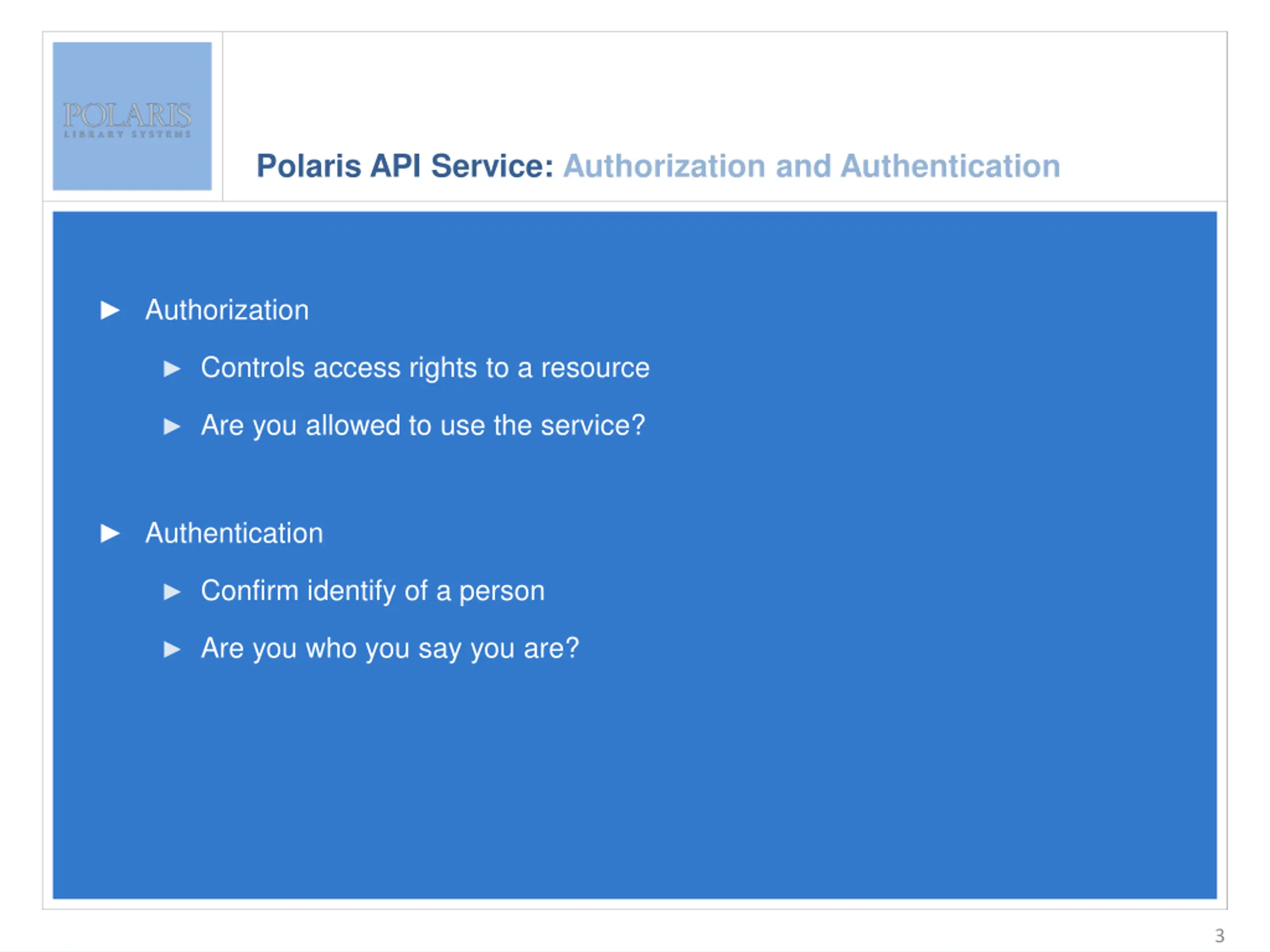 Polaris API Service: Authorization and Authentication Enter slide title here Authorization Enter bullet text here Second level Third level Are you allowed to use the service? Controls access rights to a resource Authentication Confirm identify of a person Are you who you say you are? 3