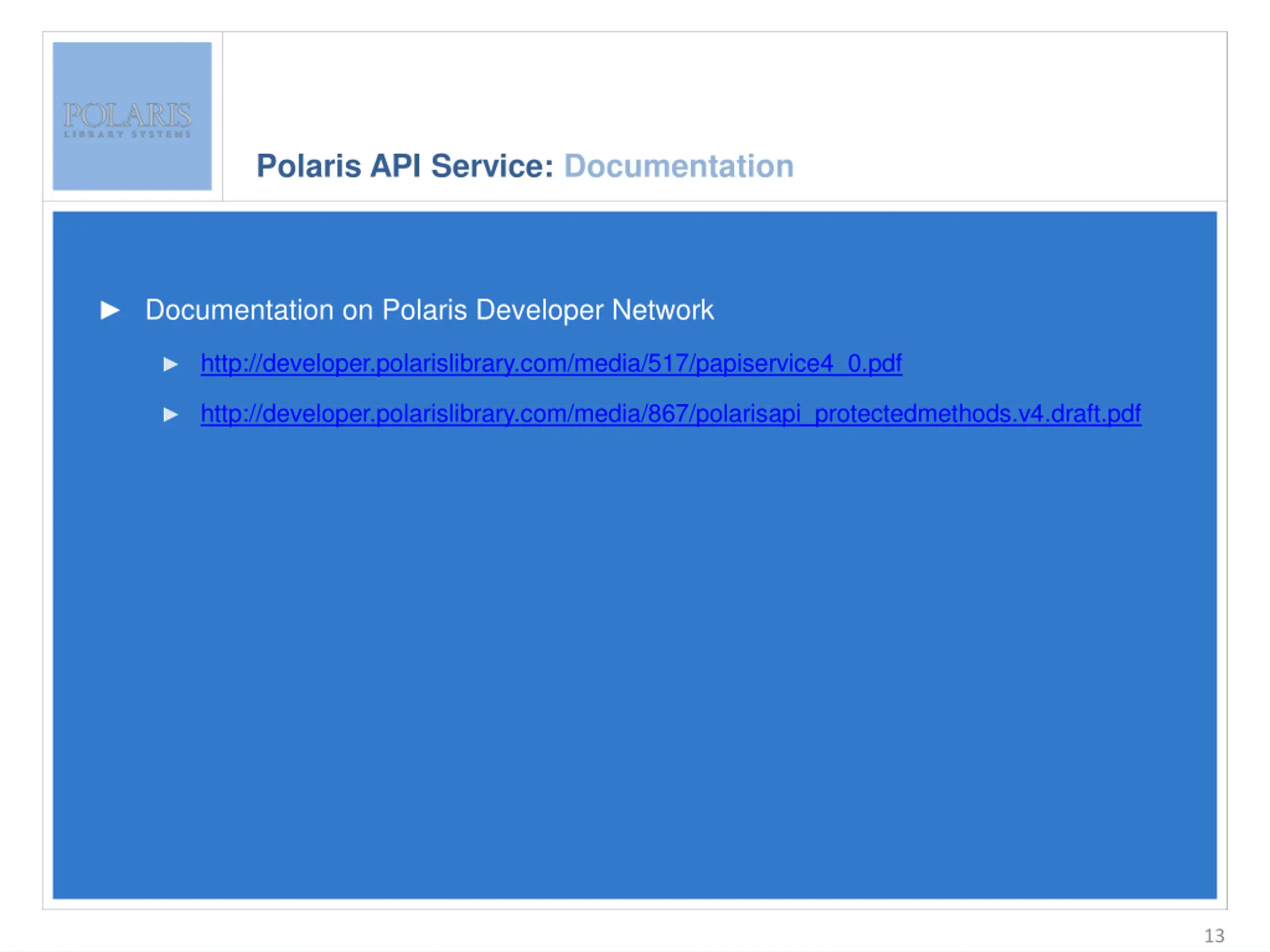 Polaris API Service: Documentation Enter slide title here Documentation on Polaris Developer Network Enter bullet text here Second level Third level http://developer.polarislibrary.com/media/867/polarisapi_protectedmethods.v4.draft.pdf http://developer.polarislibrary.com/media/517/papiservice4_0.pdf 13