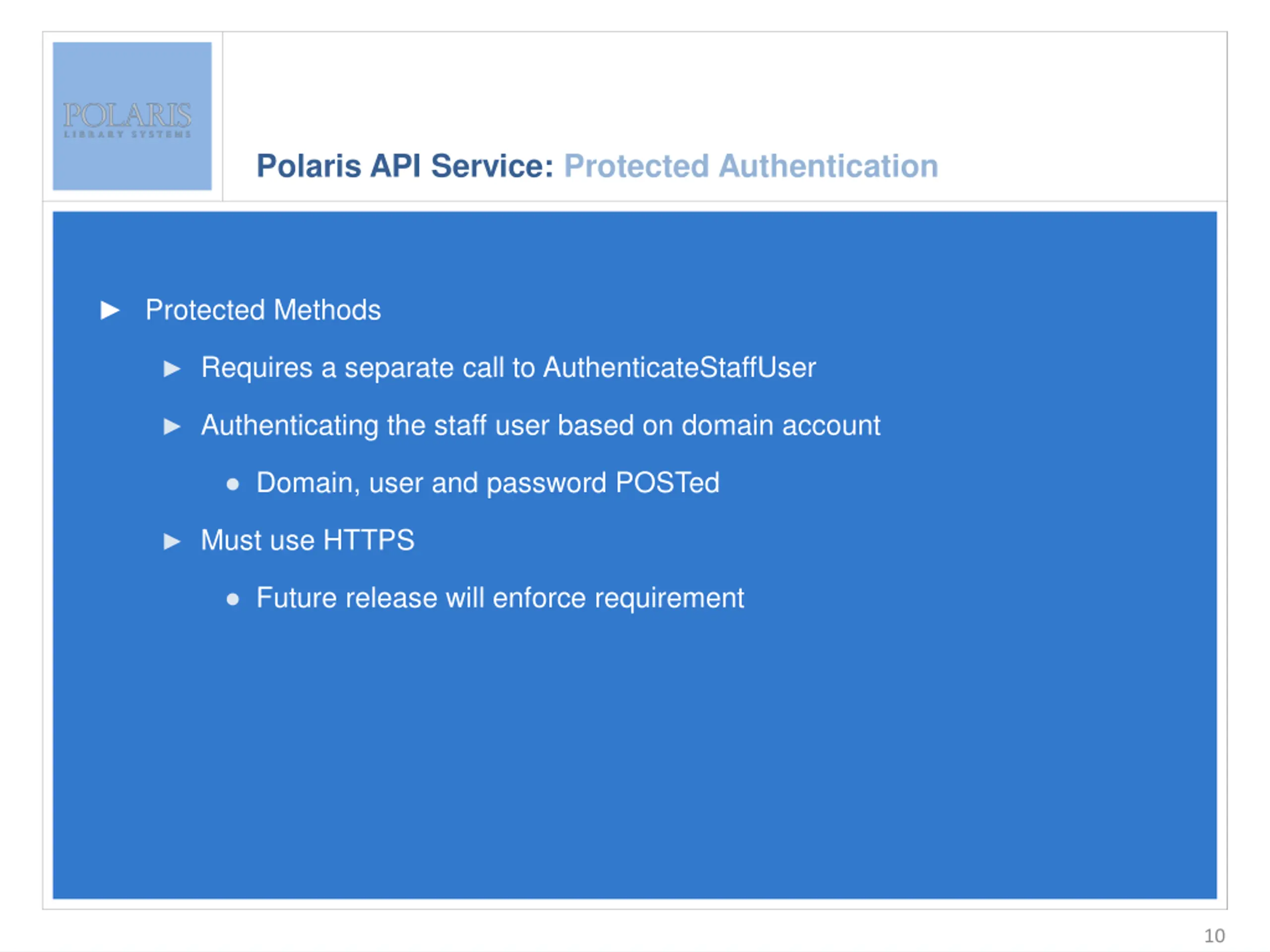 Polaris API Service: Protected Authentication Enter slide title here Protected Methods Enter bullet text here Second level Third level Authenticating the staff user based on domain account Requires a separate call to AuthenticateStaffUser Domain, user and password POSTed Must use HTTPS Future release will enforce requirement 10