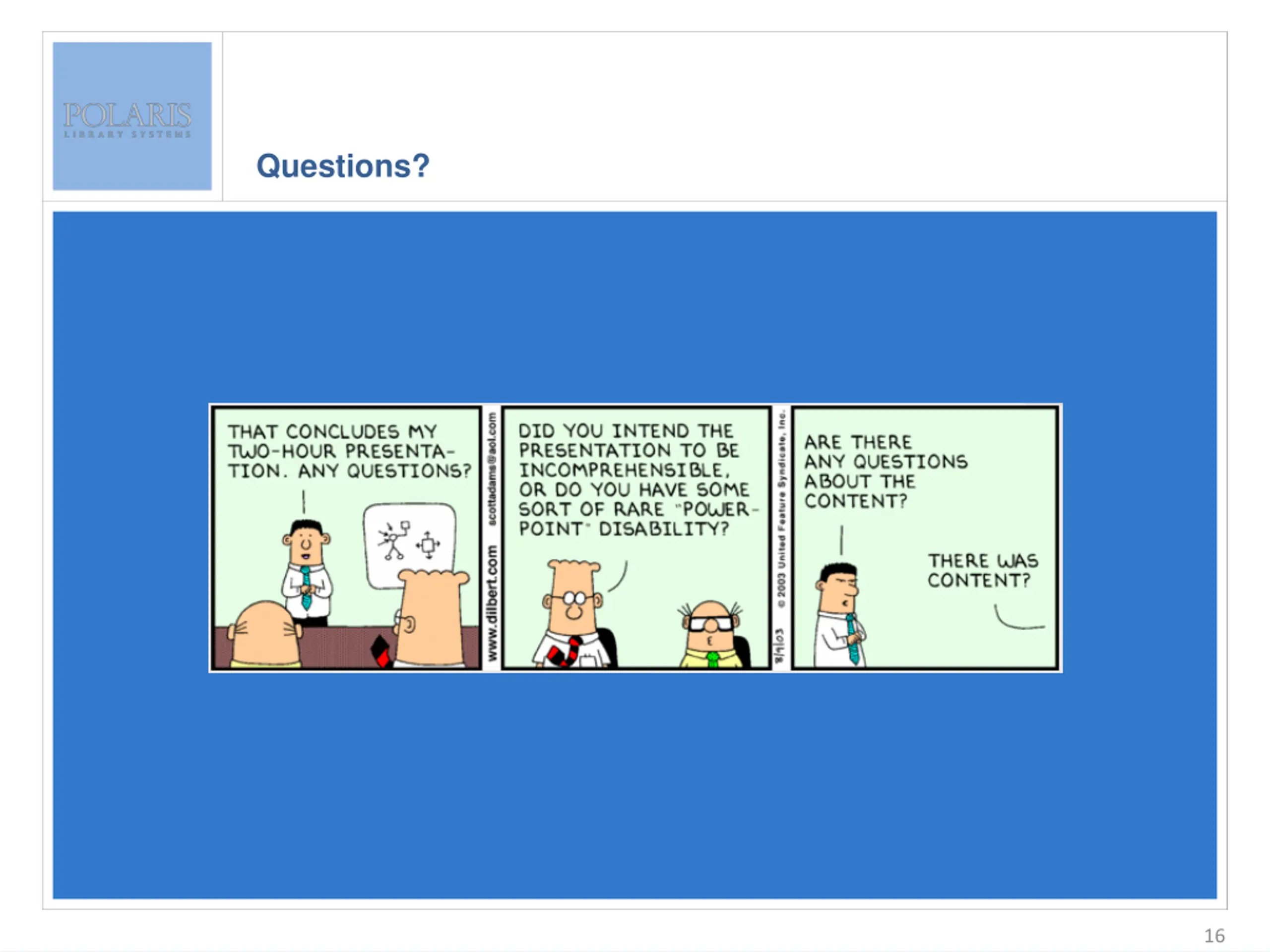 Questions? Enter slide title here Enter bullet text here Second level Third level 16