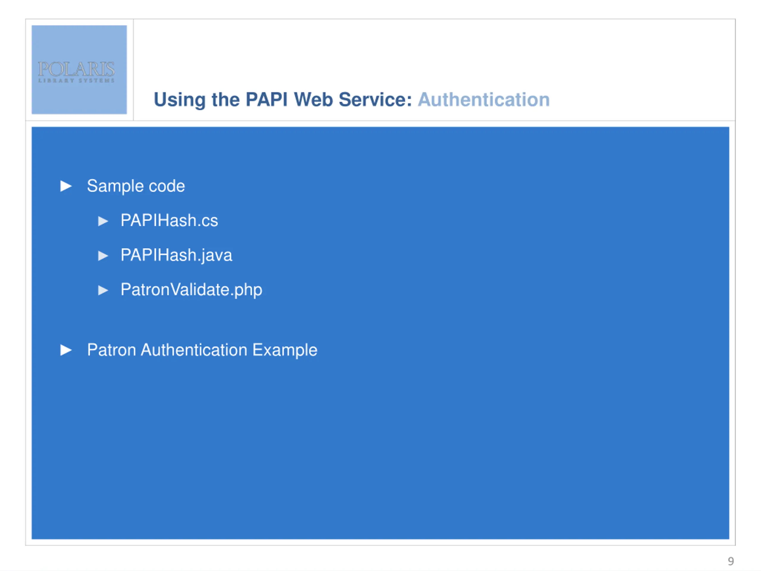 Polaris API Service: Public Authentication Enter slide title here Public Methods Enter bullet text here Second level Third level URL contains the patron s barcode Built into the URL and based on the Authorization hash signature http://orion.polarislibrary.com/PAPIService/REST/public/v1/1033/100/1/patron/25678000000251 Signature is built using the patron s password Patron password is never passed over the wire 8