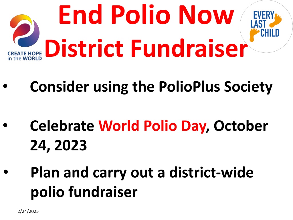 End Polio Now District Fundraiser Consider using the PolioPlus Society Celebrate World Polio Day, October 24, 2023 Plan and carry out a district-wide polio fundraiser 2/24/2025