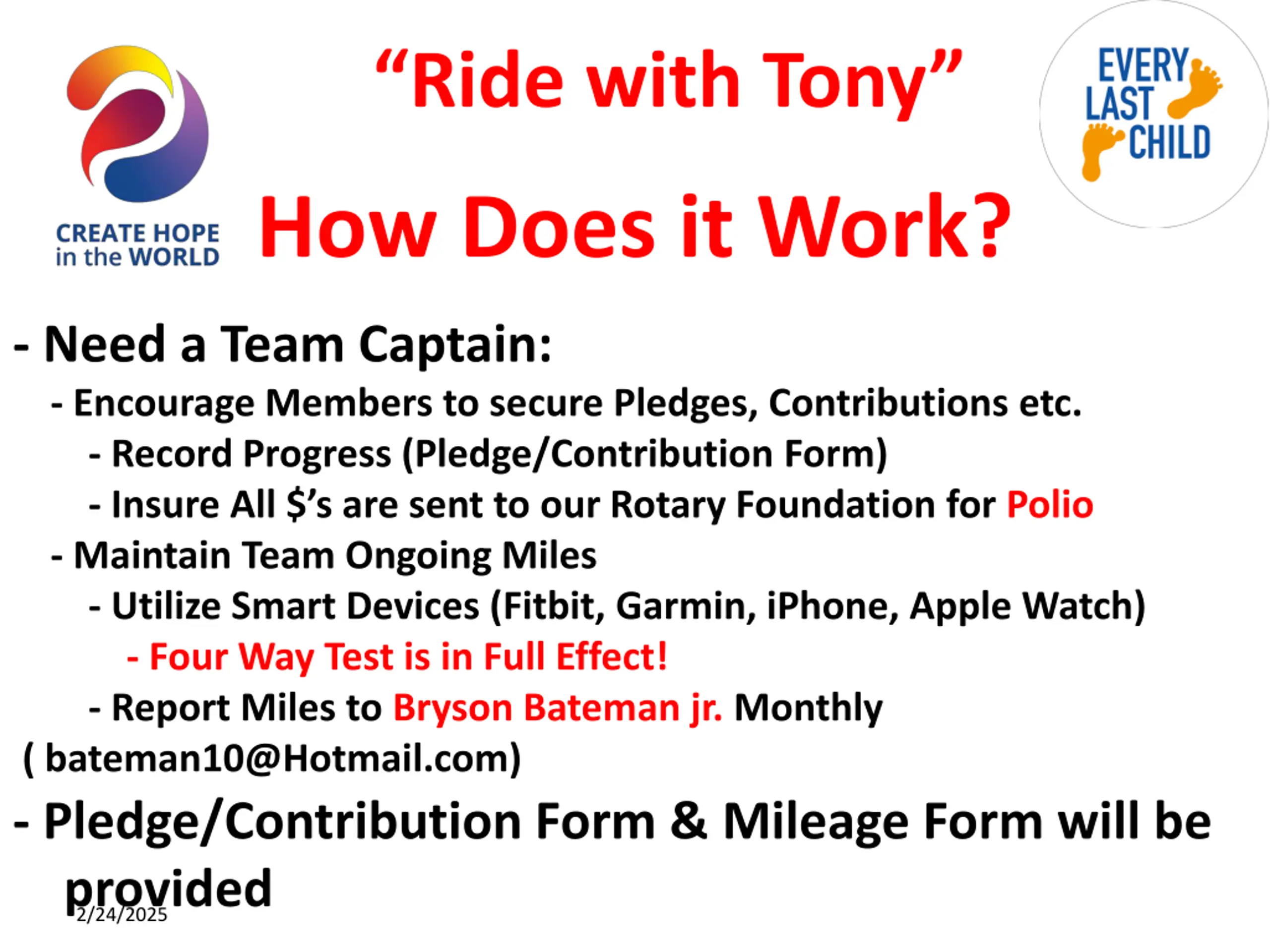 Ride with Tony How Does it Work? - Need a Team Captain: - Encourage Members to secure Pledges, Contributions etc. - Record Progress (Pledge/Contribution Form) - Insure All $ s are sent to our Rotary Foundation for Polio - Maintain Team Ongoing Miles - Utilize Smart Devices (Fitbit, Garmin, iPhone, Apple Watch) - Four Way Test is in Full Effect! - Report Miles to Bryson Bateman jr. Monthly ( bateman10@Hotmail.com) - Pledge/Contribution Form & Mileage Form will be provided 2/24/2025