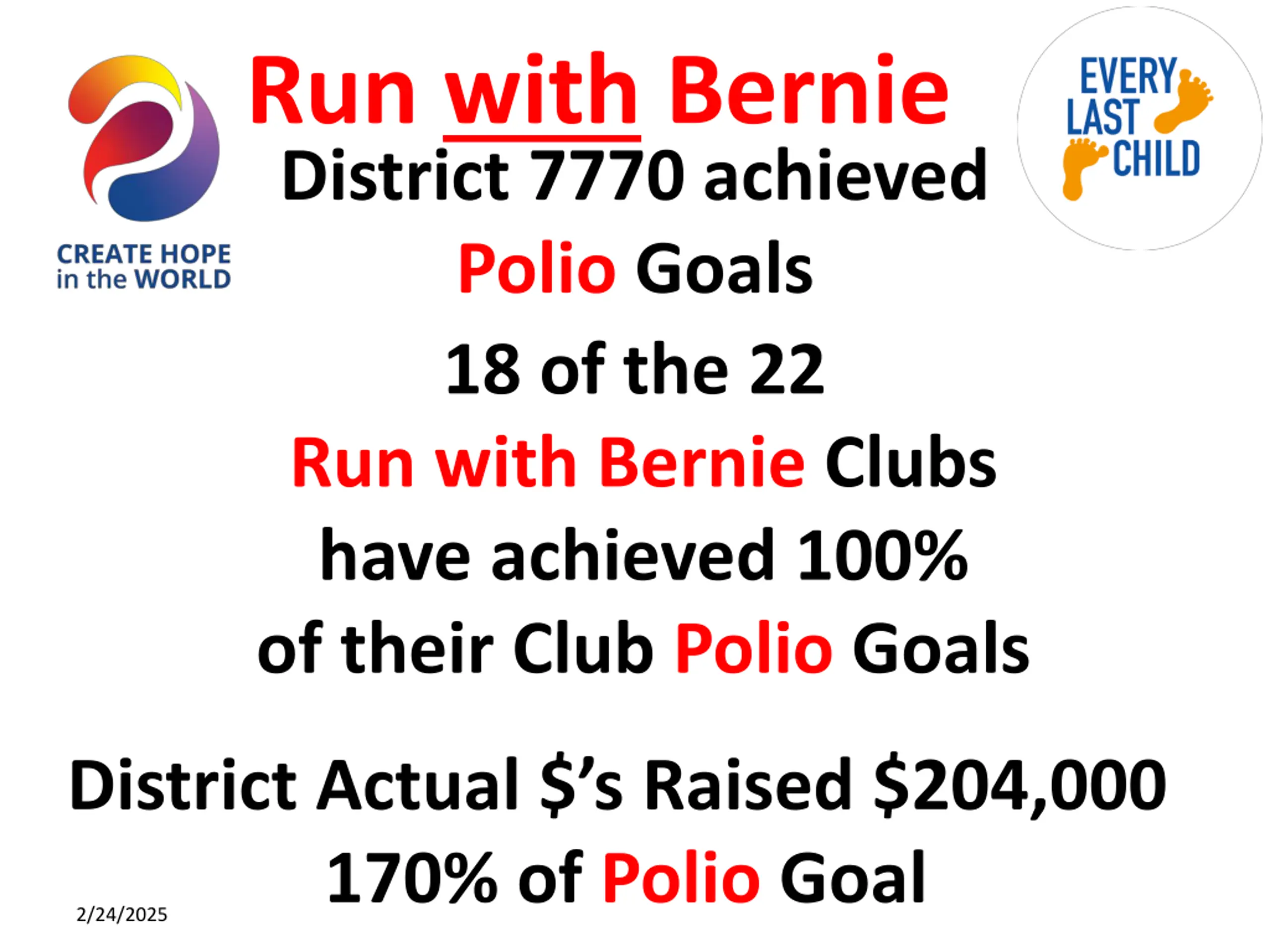 Run with Bernie District 7770 achieved Polio Goals 18 of the 22 Run with Bernie Clubs have achieved 100% of their Club Polio Goals District Actual $ s Raised $204,000 170% of Polio Goal 2/24/2025