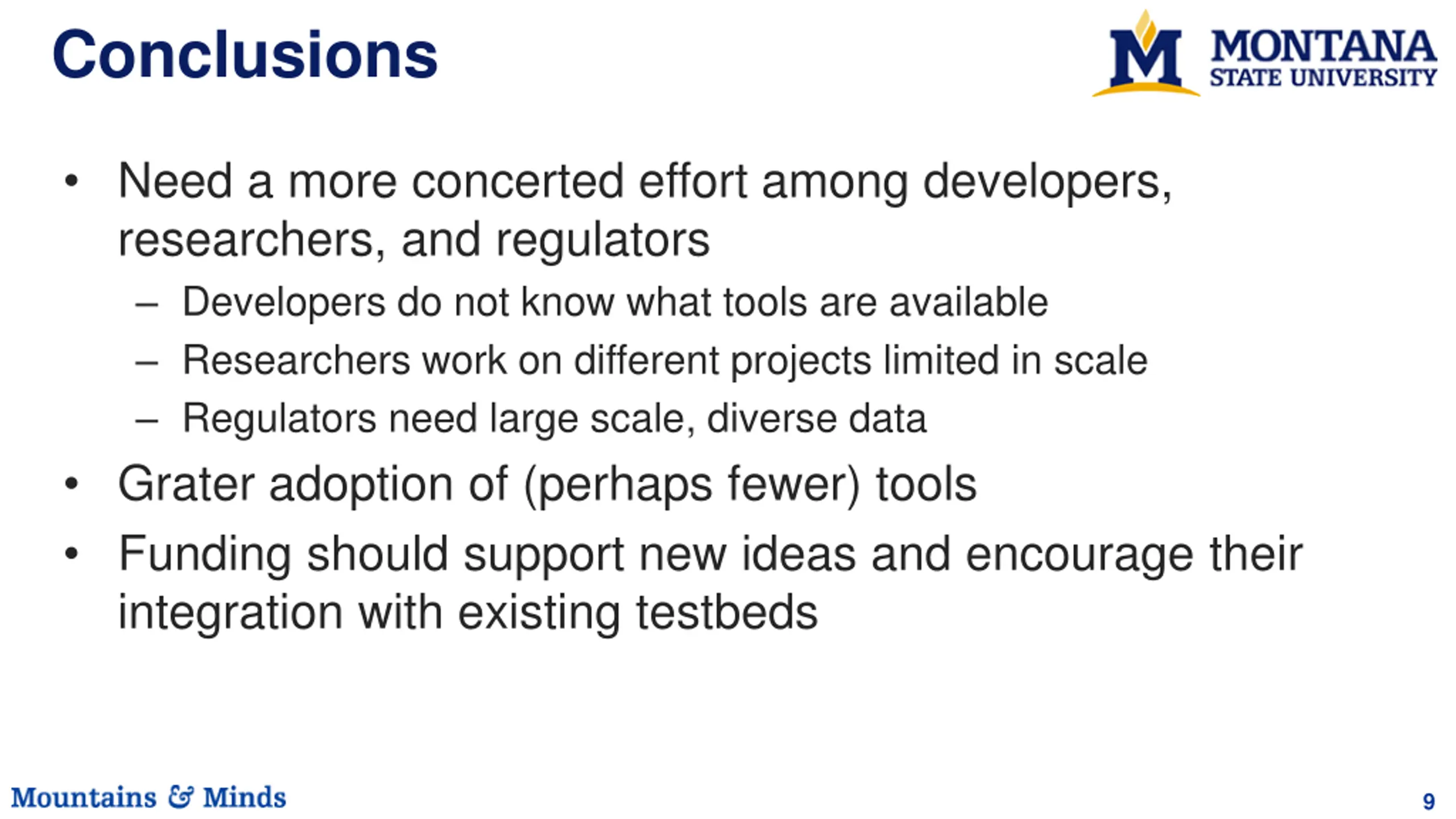 Conclusions Need a more concerted effort among developers, researchers, and regulators Developers do not know what tools are available Researchers work on different projects limited in scale Regulators need large scale, diverse data Grater adoption of (perhaps fewer) tools Funding should support new ideas and encourage their integration with existing testbeds 9