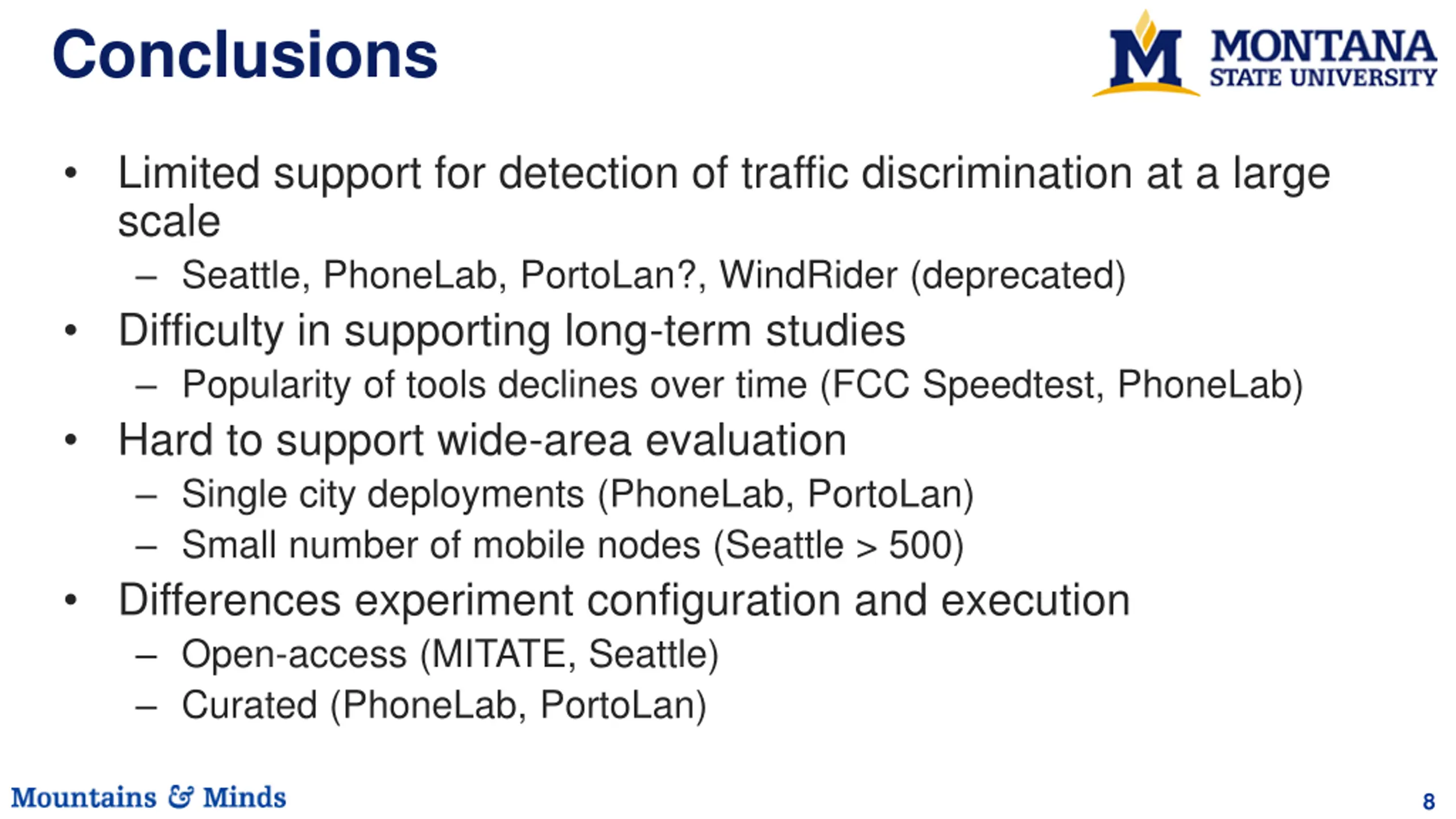 Conclusions Limited support for detection of traffic discrimination at a large scale Seattle, PhoneLab, PortoLan?, WindRider (deprecated) Difficulty in supporting long-term studies Popularity of tools declines over time (FCC Speedtest, PhoneLab) Hard to support wide-area evaluation Single city deployments (PhoneLab, PortoLan) Small number of mobile nodes (Seattle > 500) Differences experiment configuration and execution Open-access (MITATE, Seattle) Curated (PhoneLab, PortoLan) 8