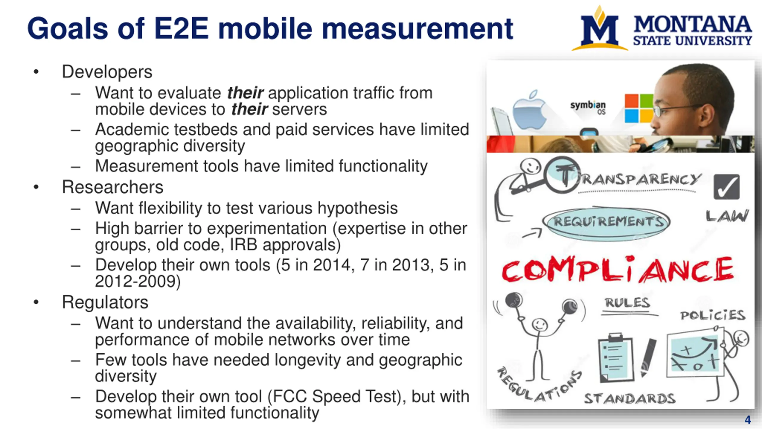 Survey of End-to-End Mobile Network Measurement Testbeds Utkarsh Goel (MSU), Mike P. Wittie (MSU), KC Claffy (CAIDA), and Andrew Le (Mintybit) Nov 12, 2014 2