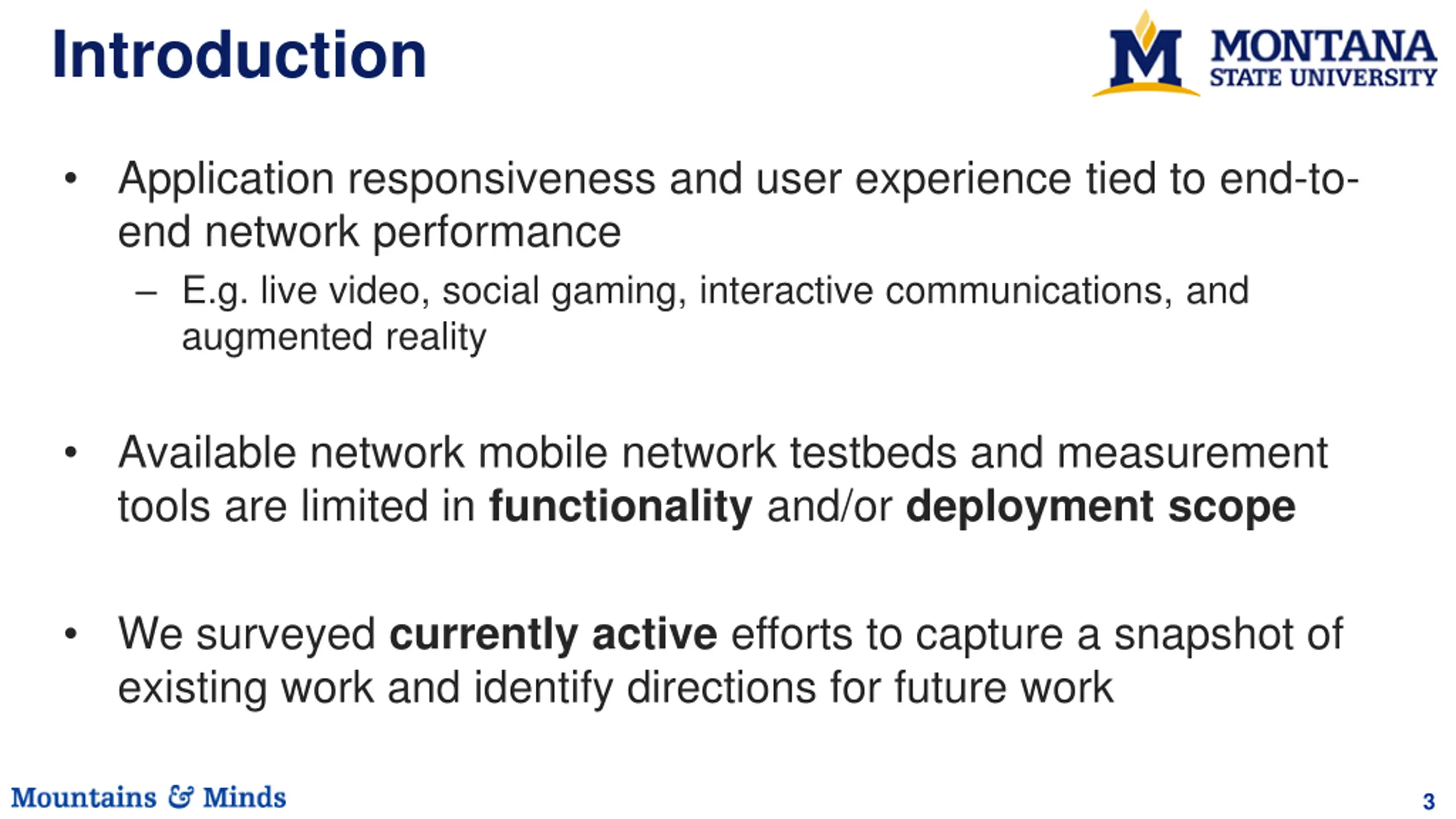 Introduction Application responsiveness and user experience tied to end-to- end network performance E.g. live video, social gaming, interactive communications, and augmented reality Available network mobile network testbeds and measurement tools are limited in functionality and/or deployment scope We surveyed currently active efforts to capture a snapshot of existing work and identify directions for future work 3