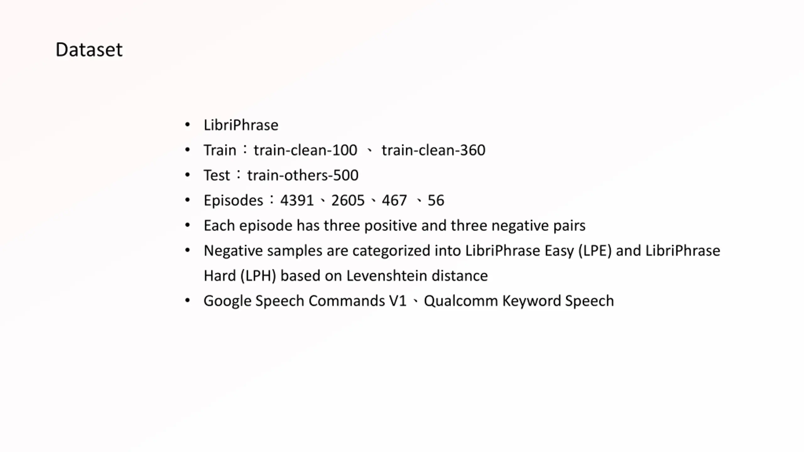 Dataset LibriPhrase Train train-clean-100 train-clean-360 Test train-others-500 Episodes 4391 2605 467 56 Each episode has three positive and three negative pairs Negative samples are categorized into LibriPhrase Easy (LPE) and LibriPhrase Hard (LPH) based on Levenshtein distance Google Speech Commands V1 Qualcomm Keyword Speech