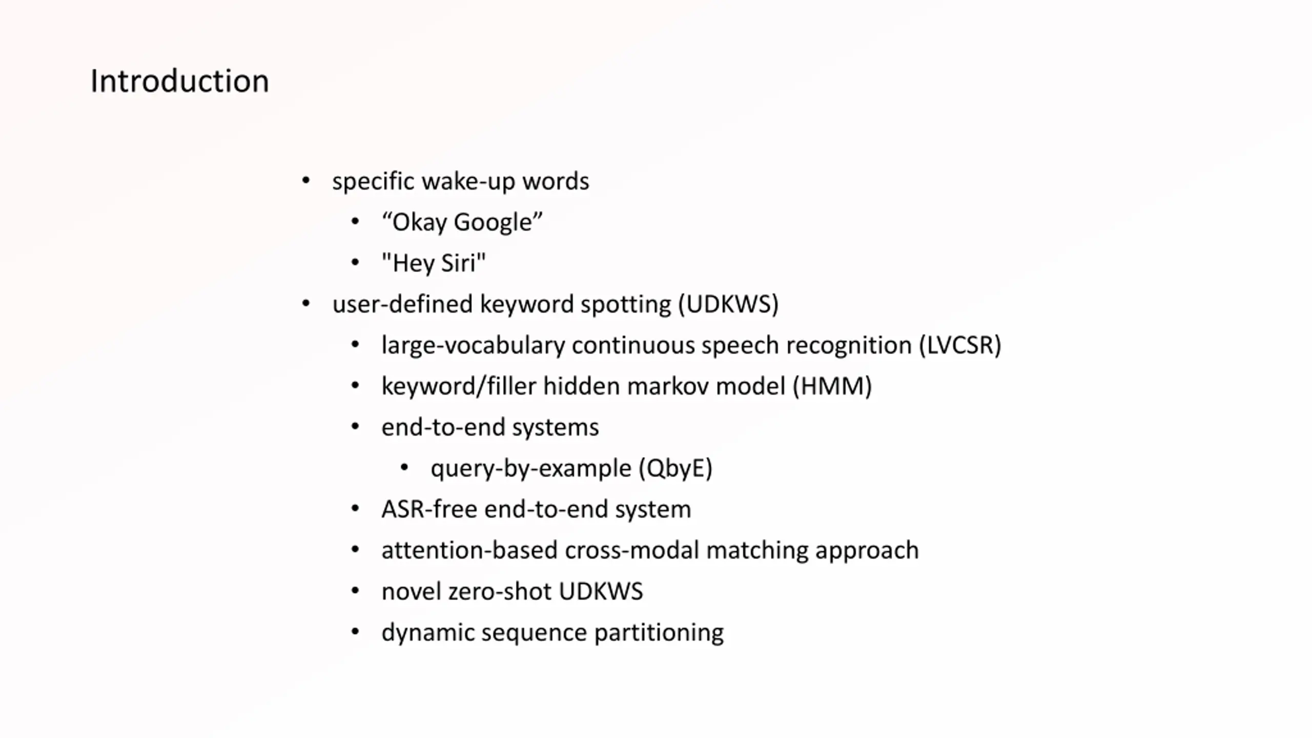 Introduction specific wake-up words Okay Google "Hey Siri" user-defined keyword spotting (UDKWS) large-vocabulary continuous speech recognition (LVCSR) keyword/filler hidden markov model (HMM) end-to-end systems query-by-example (QbyE) ASR-free end-to-end system attention-based cross-modal matching approach novel zero-shot UDKWS dynamic sequence partitioning