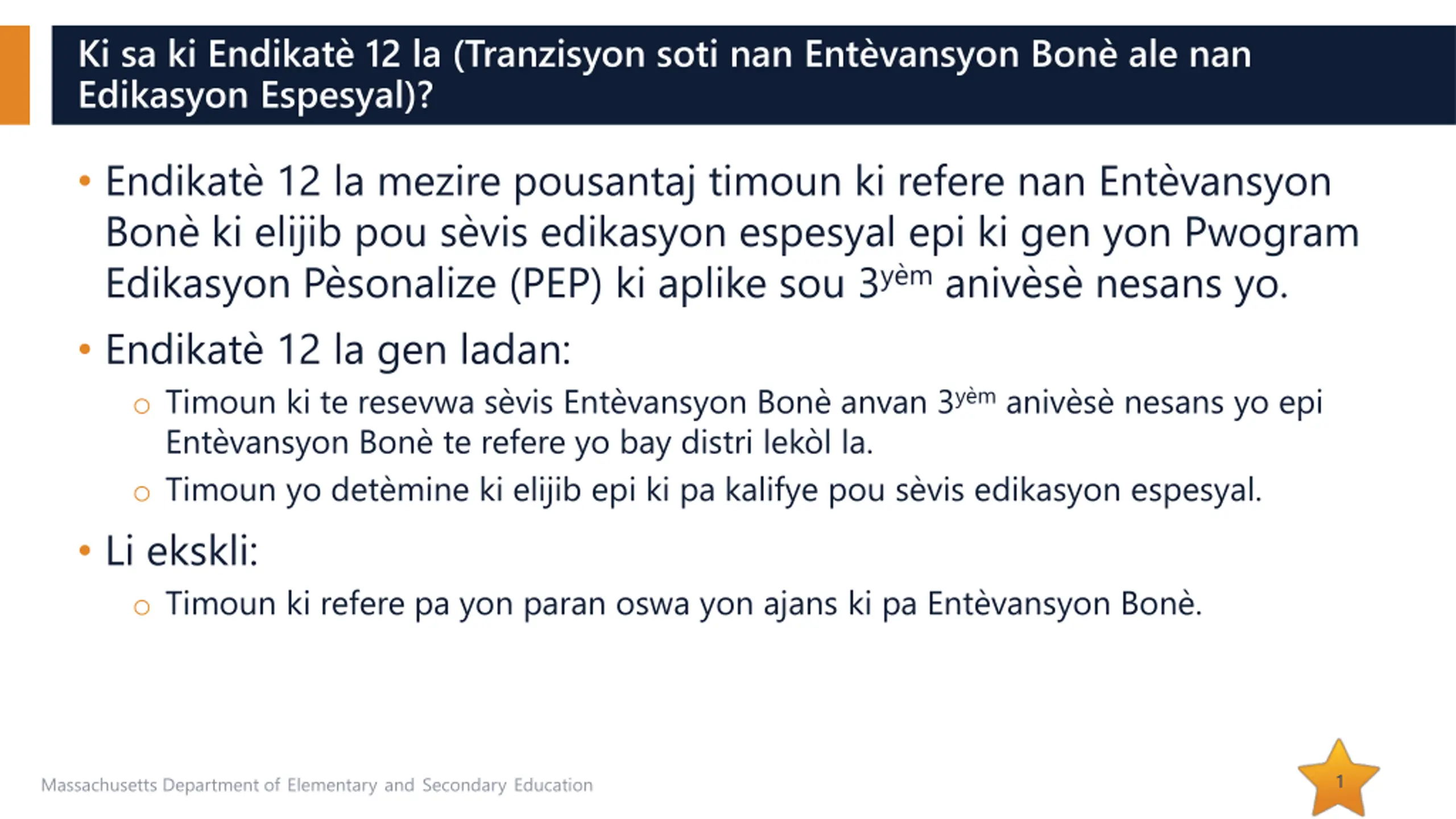 Ki sa ki Endikat 12 la (Tranzisyon soti nan Entvansyon Bon ale nan Edikasyon Espesyal)? Endikat 12 la mezire pousantaj timoun ki refere nan Ent vansyon Bon ki elijib pou s vis edikasyon espesyal epi ki gen yon Pwogram Edikasyon P sonalize (PEP) ki aplike sou 3y maniv s nesans yo. Endikat 12 la gen ladan: o Timoun ki te resevwa s vis Ent vansyon Bon anvan 3y maniv s nesans yo epi Ent vansyon Bon te refere yo bay distri lek l la. o Timoun yo det mine ki elijib epi ki pa kalifye pou s vis edikasyon espesyal. Li ekskli: o Timoun ki refere pa yon paran oswa yon ajans ki pa Ent vansyon Bon . 1 Massachusetts Department of Elementary and Secondary Education
