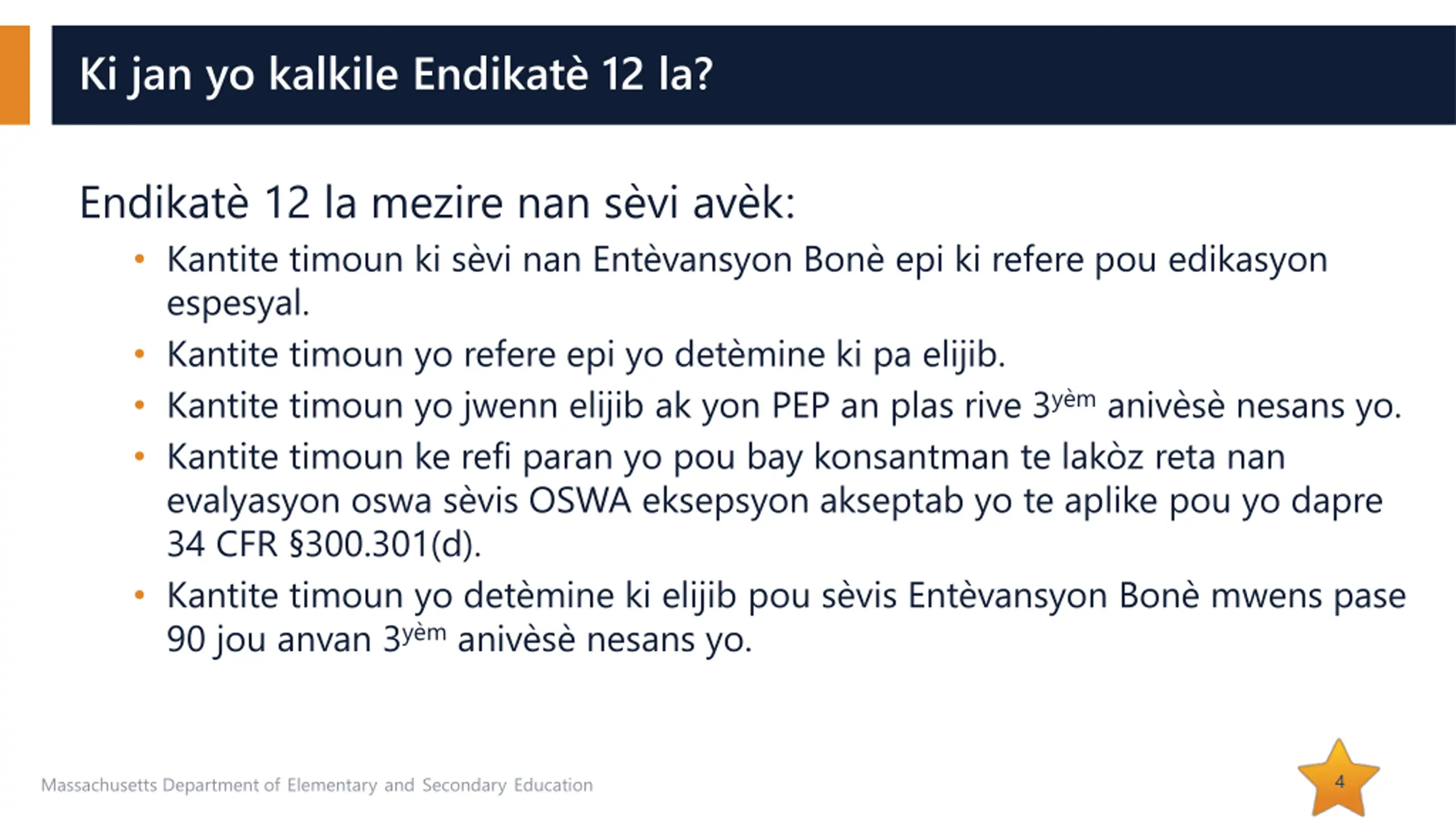 Ki jan yo kalkile Endikat 12 la? Endikat 12 la mezire nan s vi av k: Kantite timoun ki s vi nan Ent vansyon Bon epi ki refere pou edikasyon espesyal. Kantite timoun yo refere epi yo det mine ki pa elijib. Kantite timoun yo jwenn elijib ak yon PEP an plas rive 3y maniv s nesans yo. Kantite timoun ke refi paran yo pou bay konsantman te lak z reta nan evalyasyon oswa s vis OSWA eksepsyon akseptab yo te aplike pou yo dapre 34 CFR 300.301(d). Kantite timoun yo det mine ki elijib pou s vis Ent vansyon Bon mwens pase 90 jou anvan 3y maniv s nesans yo. 4 Massachusetts Department of Elementary and Secondary Education