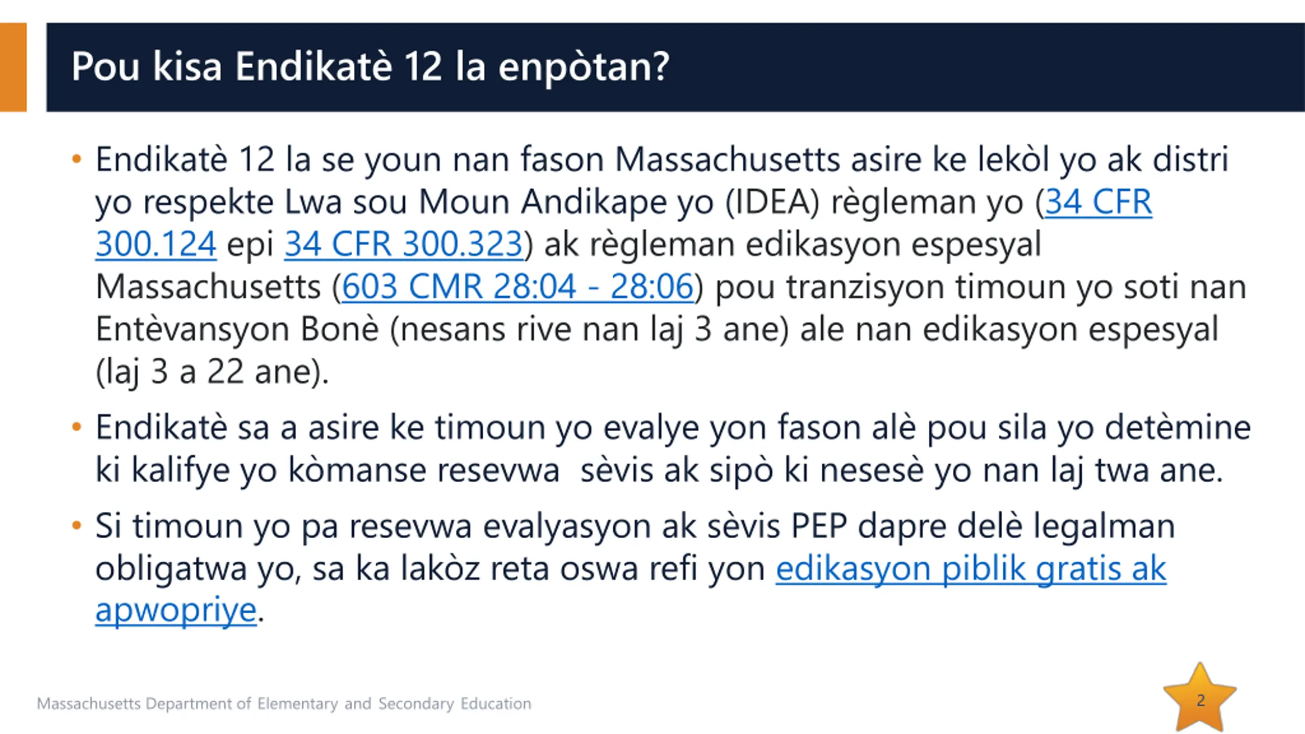 Pou kisa Endikat 12 la enptan? Endikat 12 la se youn nan fason Massachusetts asire ke lek l yo ak distri yo respekte Lwa sou Moun Andikape yo (IDEA) r gleman yo (34 CFR 300.124 epi 34 CFR 300.323) ak r gleman edikasyon espesyal Massachusetts (603 CMR 28:04 - 28:06) pou tranzisyon timoun yo soti nan Ent vansyon Bon (nesans rive nan laj 3 ane) ale nan edikasyon espesyal (laj 3 a 22 ane). Endikat sa a asire ke timoun yo evalye yon fason al pou sila yo det mine ki kalifye yo k manse resevwa s vis ak sip ki neses yo nan laj twa ane. Si timoun yo pa resevwa evalyasyon ak s vis PEP dapre del legalman obligatwa yo, sa ka lak z reta oswa refi yon edikasyon piblik gratis ak apwopriye. 2 Massachusetts Department of Elementary and Secondary Education