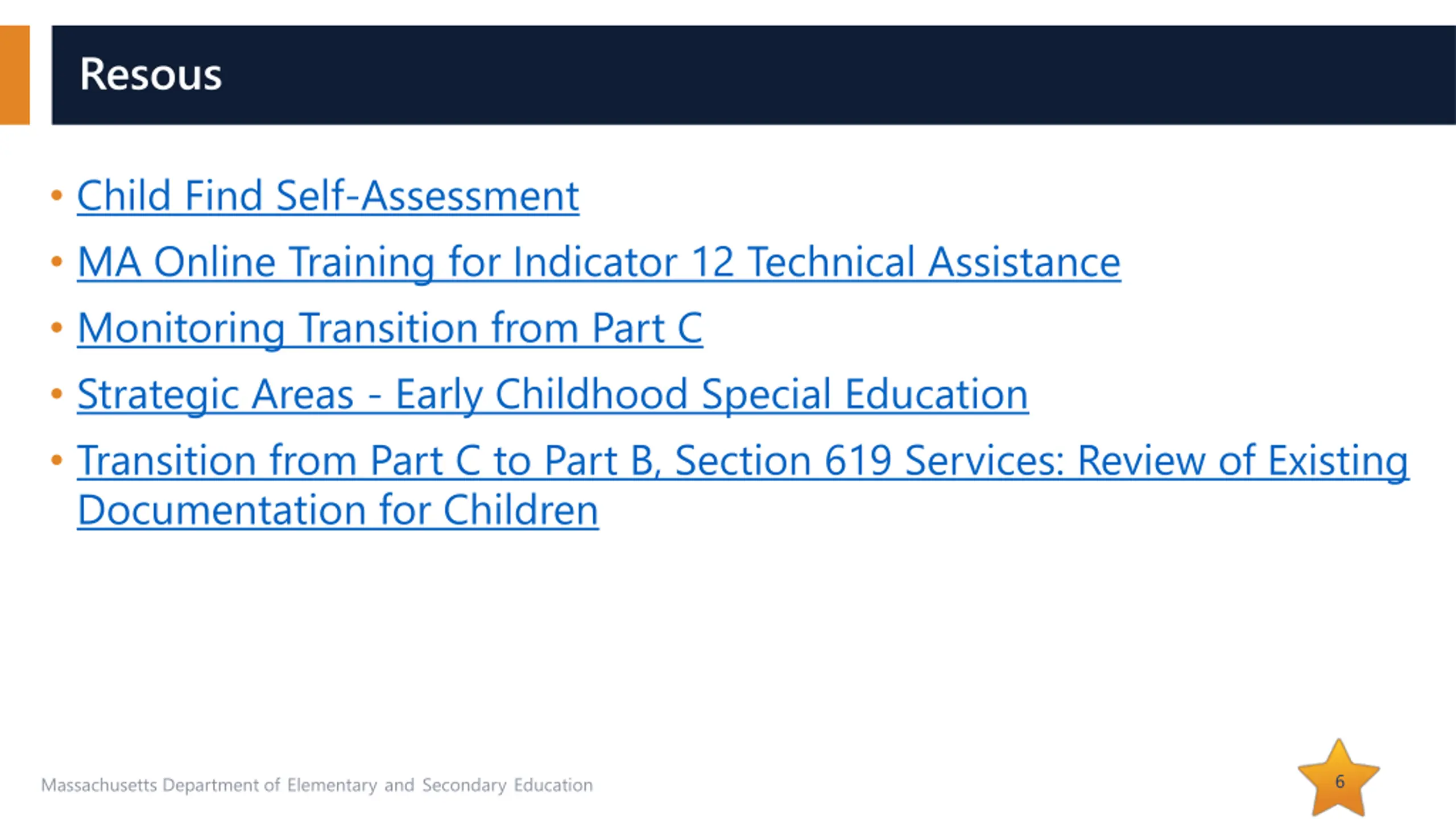 Resous Child Find Self-Assessment MA Online Training for Indicator 12 Technical Assistance Monitoring Transition from Part C Strategic Areas - Early Childhood Special Education Transition from Part C to Part B, Section 619 Services: Review of Existing Documentation for Children 6 Massachusetts Department of Elementary and Secondary Education