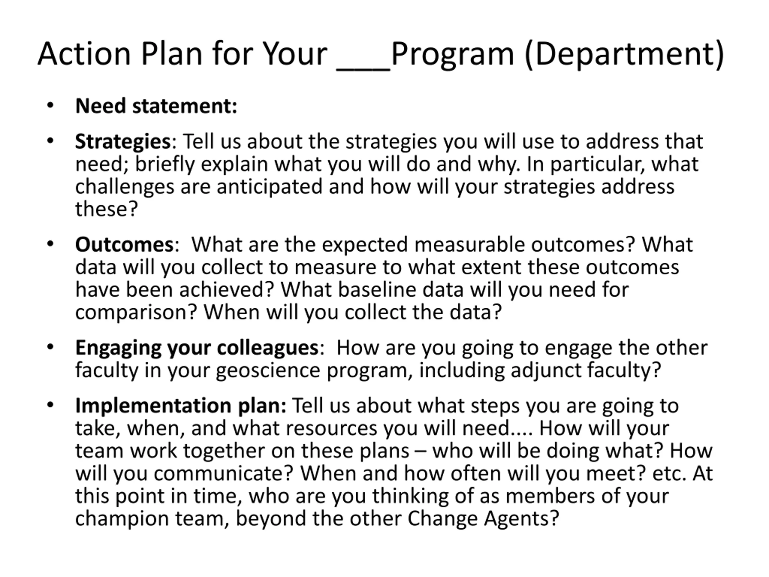 Action Plan for Your ___Program (Department) Need statement: Strategies: Tell us about the strategies you will use to address that need; briefly explain what you will do and why. In particular, what challenges are anticipated and how will your strategies address these? Outcomes: What are the expected measurable outcomes? What data will you collect to measure to what extent these outcomes have been achieved? What baseline data will you need for comparison? When will you collect the data? Engaging your colleagues: How are you going to engage the other faculty in your geoscience program, including adjunct faculty? Implementation plan: Tell us about what steps you are going to take, when, and what resources you will need.... How will your team work together on these plans who will be doing what? How will you communicate? When and how often will you meet? etc. At this point in time, who are you thinking of as members of your champion team, beyond the other Change Agents?