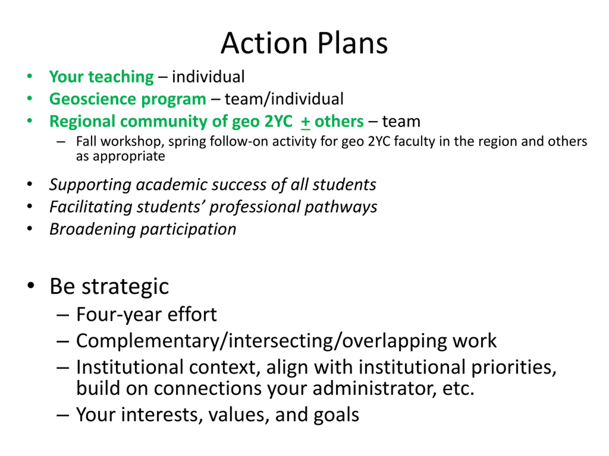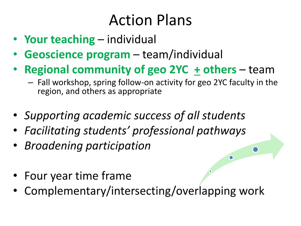 Action Plans Your teaching individual Geoscience program team/individual Regional community of geo 2YC + others team Fall workshop, spring follow-on activity for geo 2YC faculty in the region, and others as appropriate Supporting academic success of all students Facilitating students professional pathways Broadening participation Four year time frame Complementary/intersecting/overlapping work