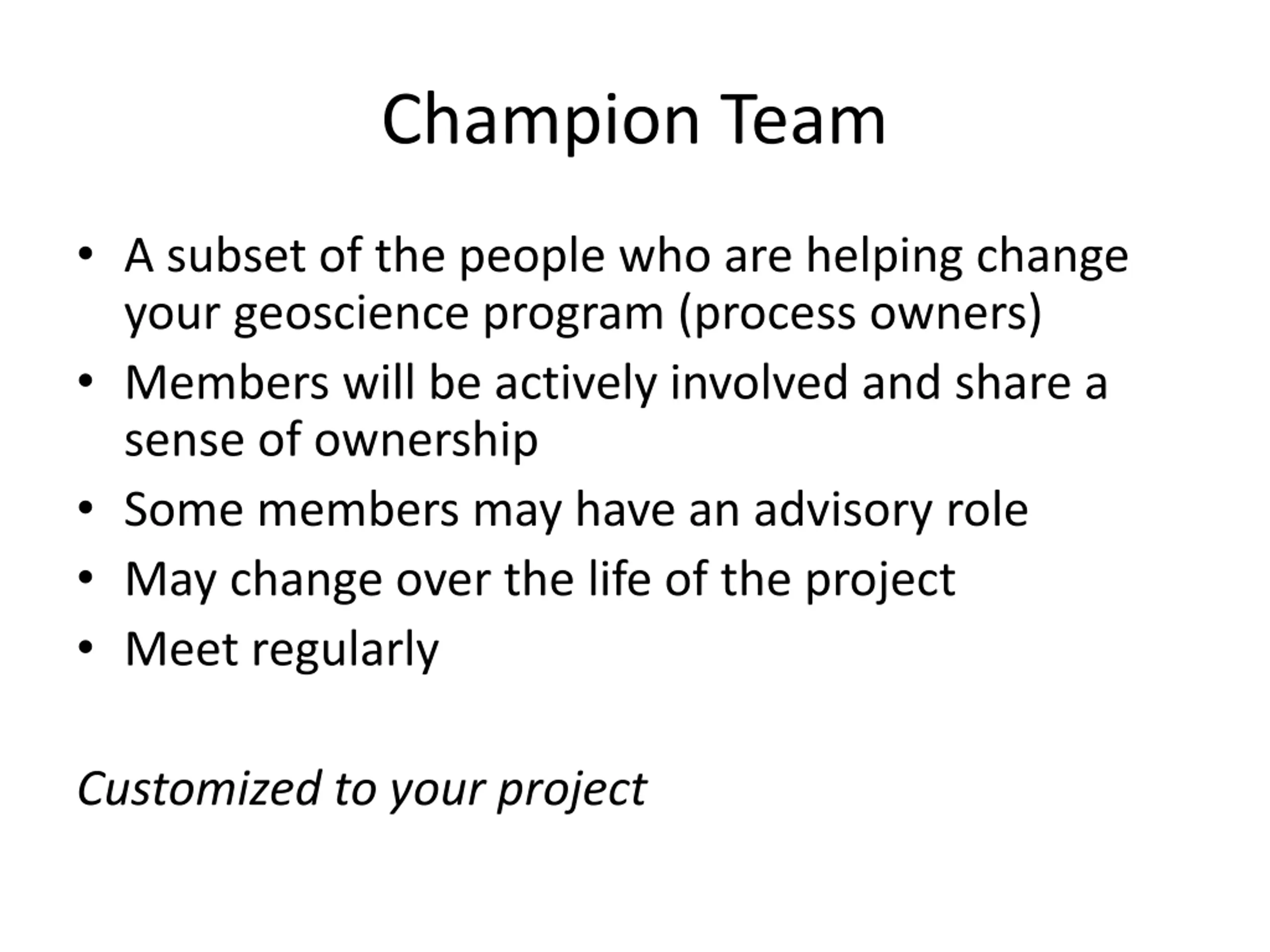 Champion Team A subset of the people who are helping change your geoscience program (process owners) Members will be actively involved and share a sense of ownership Some members may have an advisory role May change over the life of the project Meet regularly Customized to your project