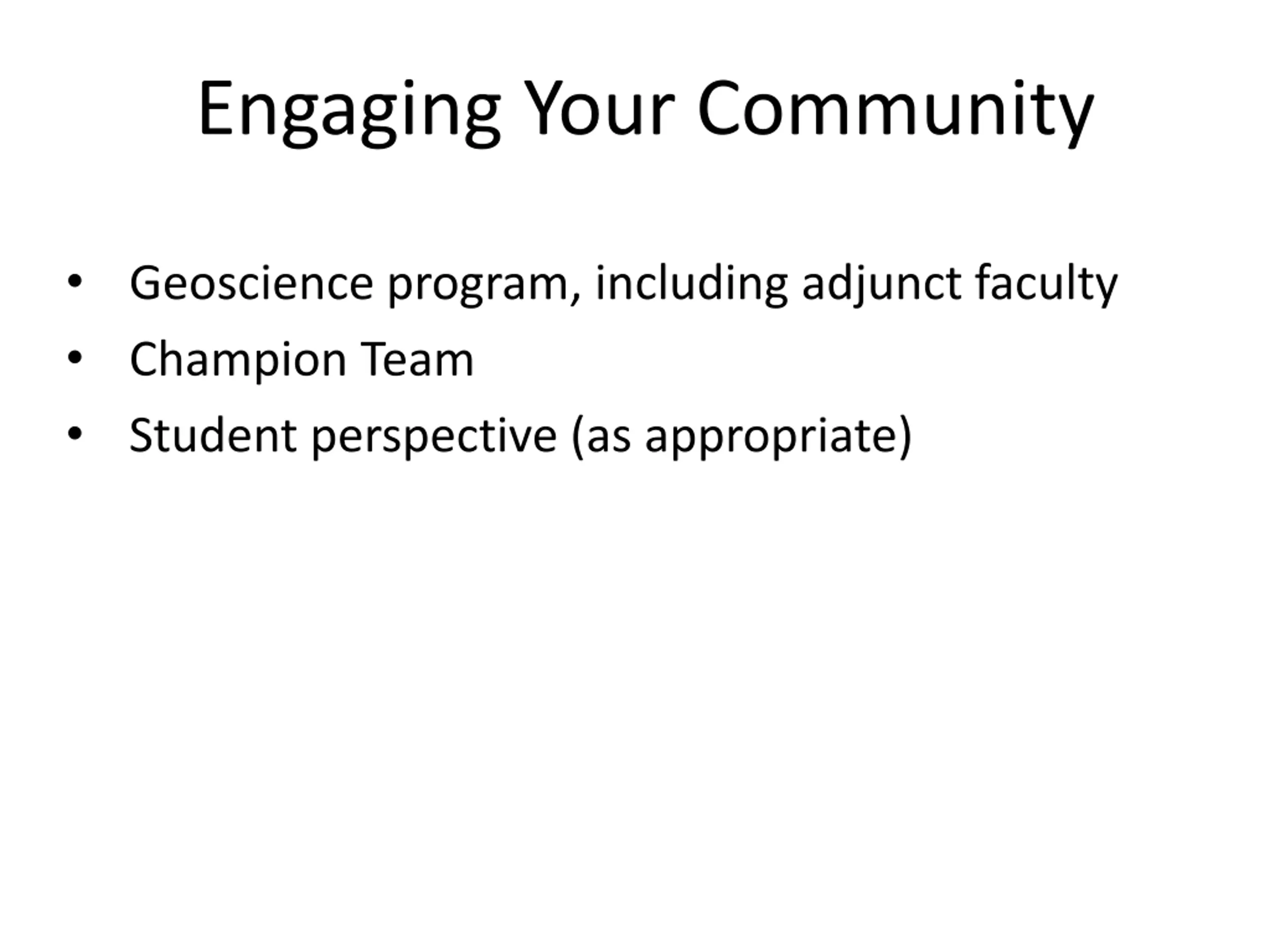 Engaging Your Community Geoscience program, including adjunct faculty Champion Team Student perspective (as appropriate)