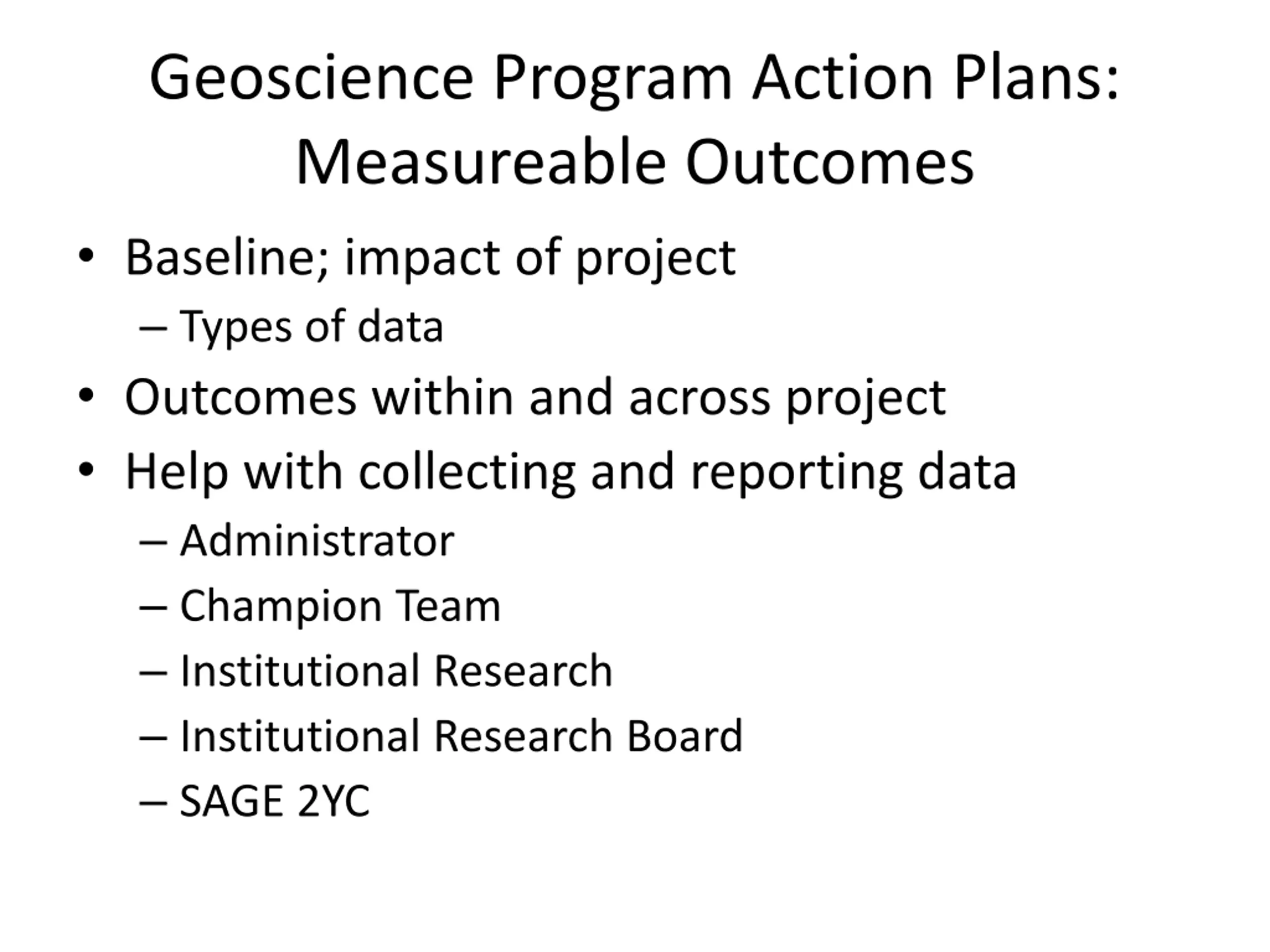 Geoscience Program Action Plans: Measureable Outcomes Baseline; impact of project Types of data Outcomes within and across project Help with collecting and reporting data Administrator Champion Team Institutional Research Institutional Research Board SAGE 2YC