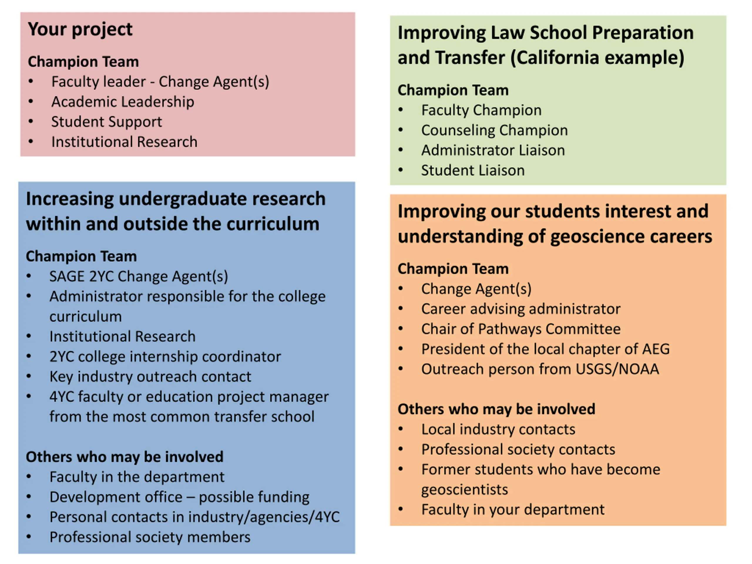 Your project Improving Law School Preparation and Transfer (California example) Champion Team Faculty leader - Change Agent(s) Academic Leadership Student Support Institutional Research Champion Team Faculty Champion Counseling Champion Administrator Liaison Student Liaison Increasing undergraduate research within and outside the curriculum Improving our students interest and understanding of geoscience careers Champion Team SAGE 2YC Change Agent(s) Administrator responsible for the college curriculum Institutional Research 2YC college internship coordinator Key industry outreach contact 4YC faculty or education project manager from the most common transfer school Champion Team Change Agent(s) Career advising administrator Chair of Pathways Committee President of the local chapter of AEG Outreach person from USGS/NOAA Others who may be involved Local industry contacts Professional society contacts Former students who have become geoscientists Faculty in your department Others who may be involved Faculty in the department Development office possible funding Personal contacts in industry/agencies/4YC Professional society members