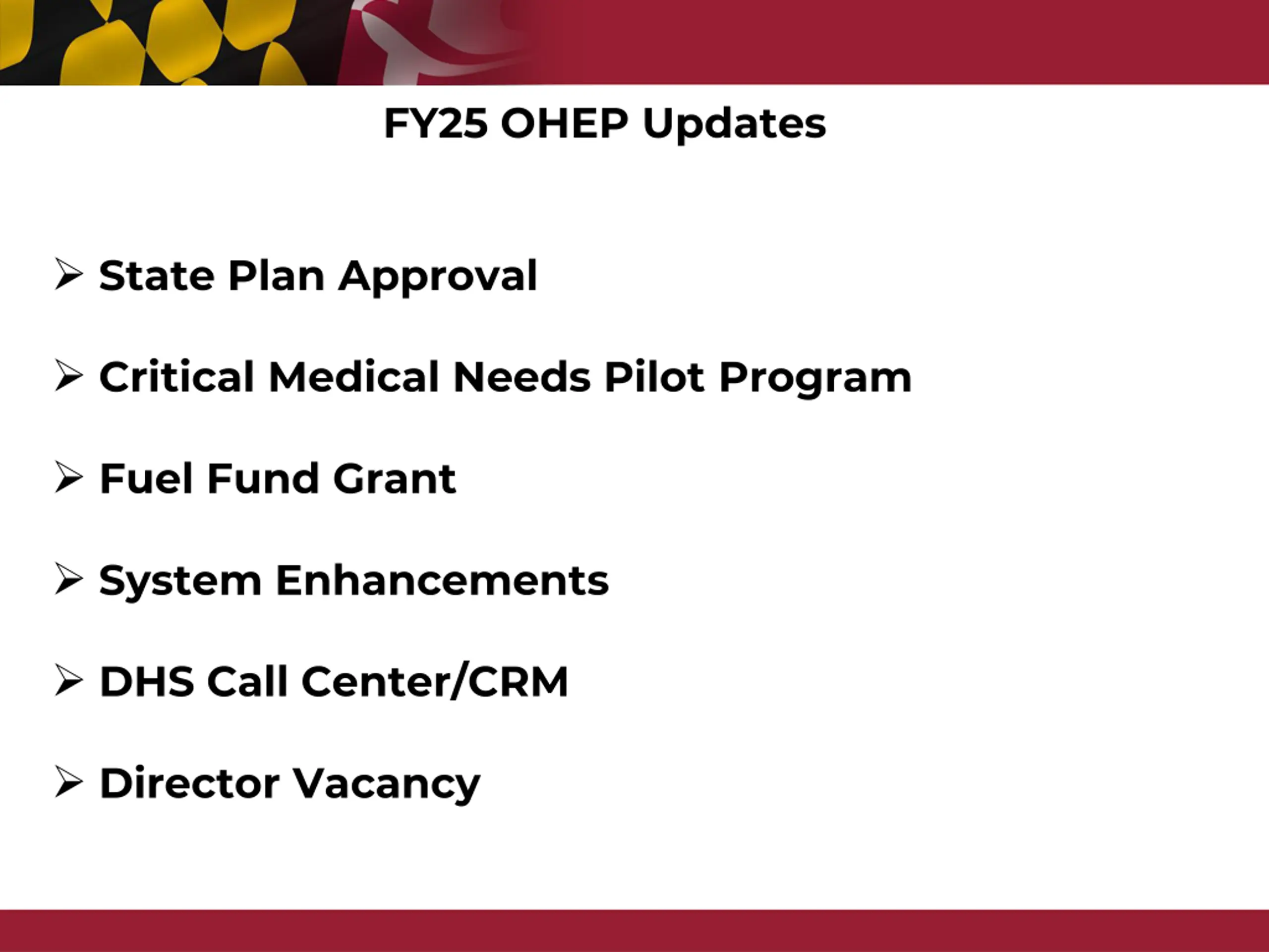 FY25 OHEP Updates State Plan Approval Critical Medical Needs Pilot Program Fuel Fund Grant System Enhancements DHS Call Center/CRM Director Vacancy