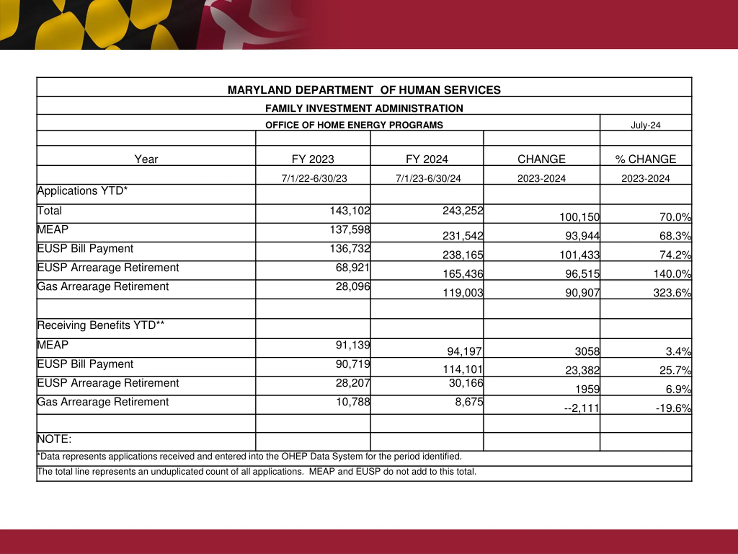 MARYLAND DEPARTMENT OF HUMAN SERVICES FAMILY INVESTMENT ADMINISTRATION July-24 OFFICE OF HOME ENERGY PROGRAMS Year FY 2023 FY 2024 CHANGE % CHANGE 7/1/22-6/30/23 7/1/23-6/30/24 2023-2024 2023-2024 Applications YTD* Total MEAP EUSP Bill Payment EUSP Arrearage Retirement Gas Arrearage Retirement 143,102 137,598 136,732 68,921 28,096 243,252 100,150 93,944 101,433 96,515 90,907 70.0% 68.3% 74.2% 140.0% 323.6% 231,542 238,165 165,436 119,003 Receiving Benefits YTD** MEAP EUSP Bill Payment EUSP Arrearage Retirement Gas Arrearage Retirement 91,139 90,719 28,207 10,788 94,197 114,101 30,166 8,675 3058 23,382 1959 --2,111 3.4% 25.7% 6.9% -19.6% NOTE: *Data represents applications received and entered into the OHEP Data System for the period identified. The total line represents an unduplicated count of all applications. MEAP and EUSP do not add to this total.