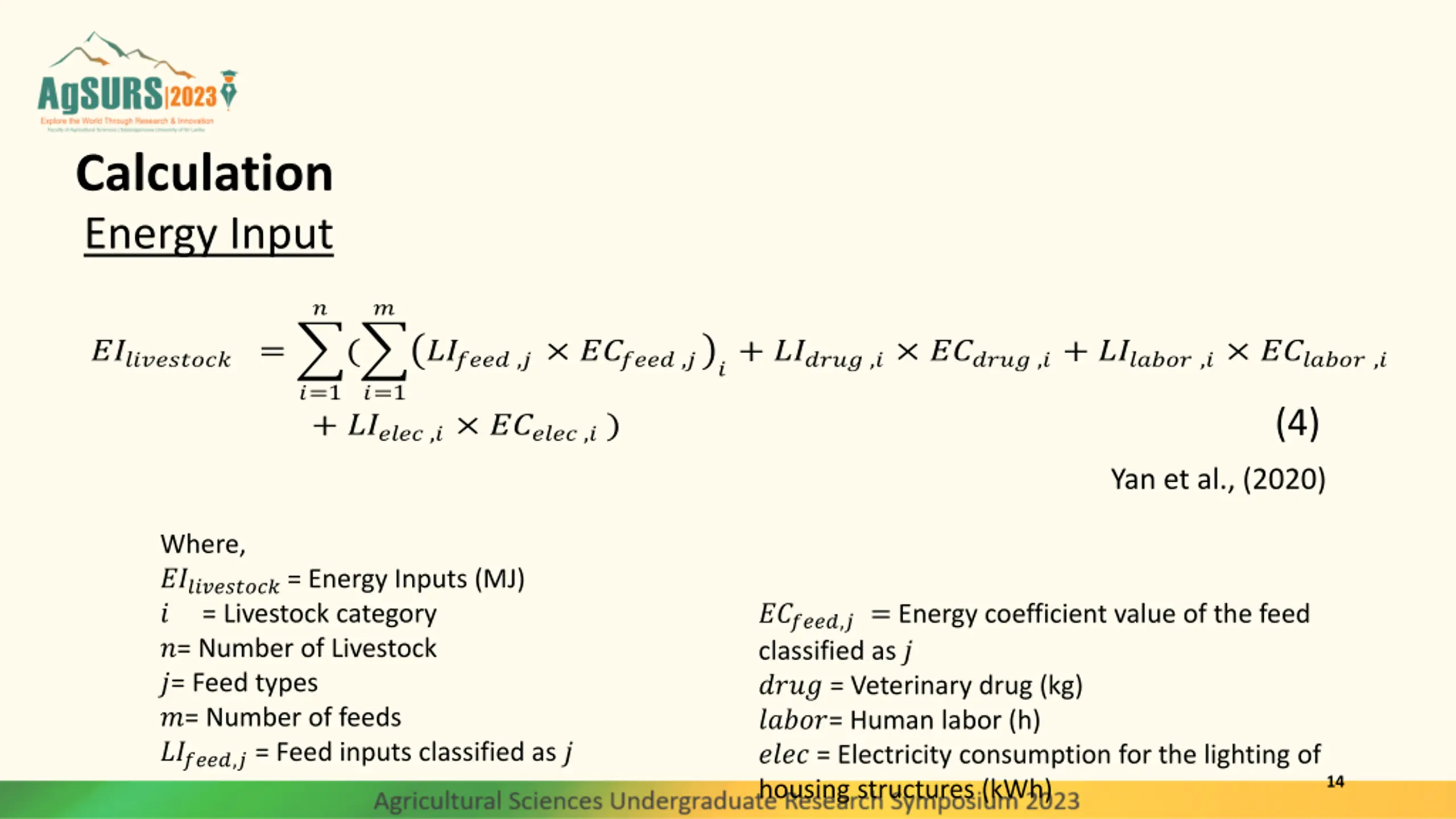 Calculation Energy Input ? ? ???????????=( ?????? ,? ?????? ,??+ ?????? ,? ?????? ,?+ ??????? ,? ??????? ,? ?=1 ?=1 + ?????? ,? ?????? ,?) (4) Yan et al., (2020) Where, ??????????? = Energy Inputs (MJ) ? = Livestock category ?= Number of Livestock ?= Feed types ?= Number of feeds ??????,? = Feed inputs classified as ? ??????,? = Energy coefficient value of the feed classified as ? ???? = Veterinary drug (kg) ?????= Human labor (h) ???? = Electricity consumption for the lighting of housing structures (kWh) 14
