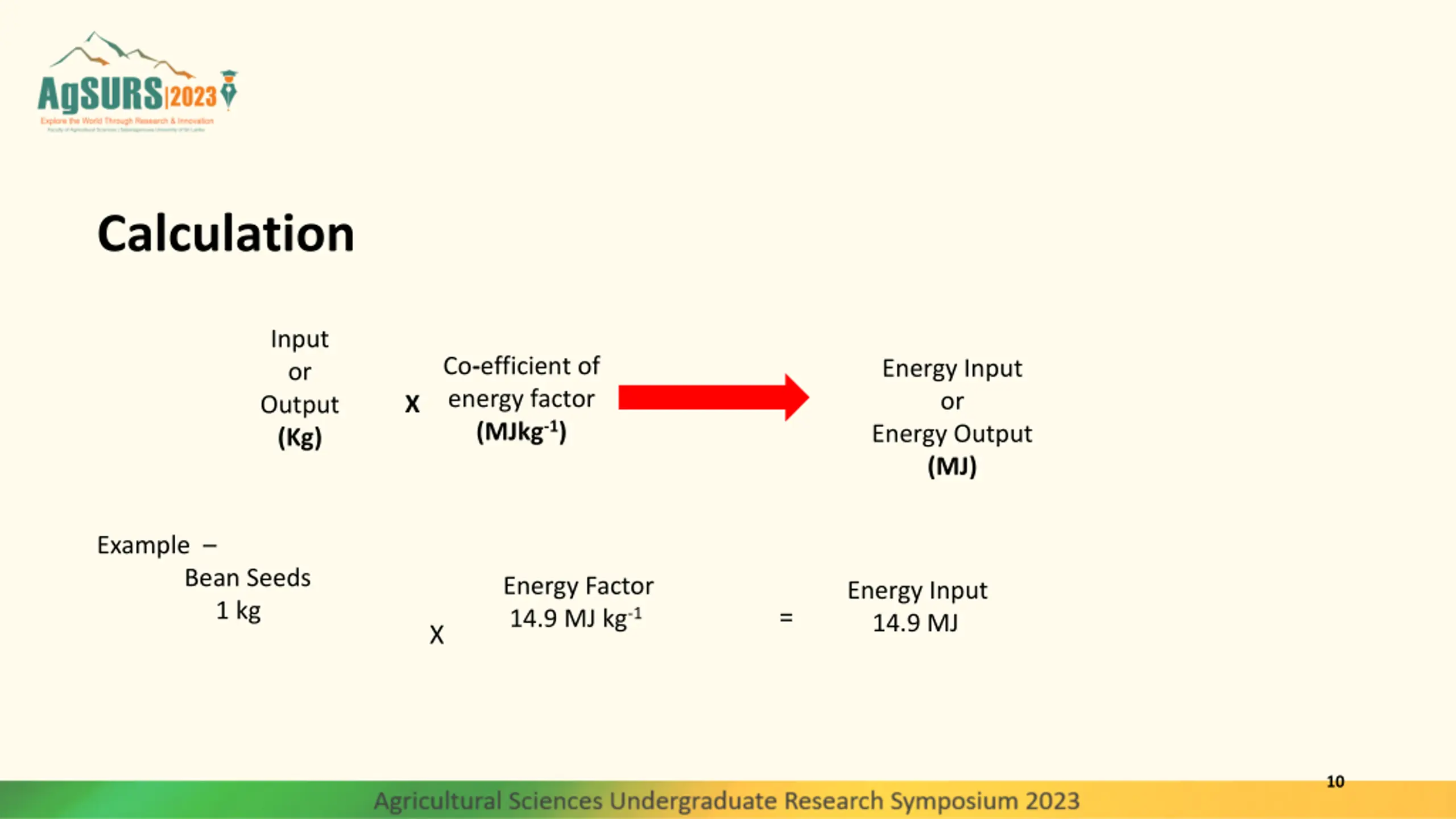 Calculation Input or Output (Kg) Co-efficient of energy factor (MJkg-1) Energy Input or Energy Output (MJ) X Example Bean Seeds 1 kg Energy Factor 14.9 MJ kg-1 Energy Input 14.9 MJ = X 10