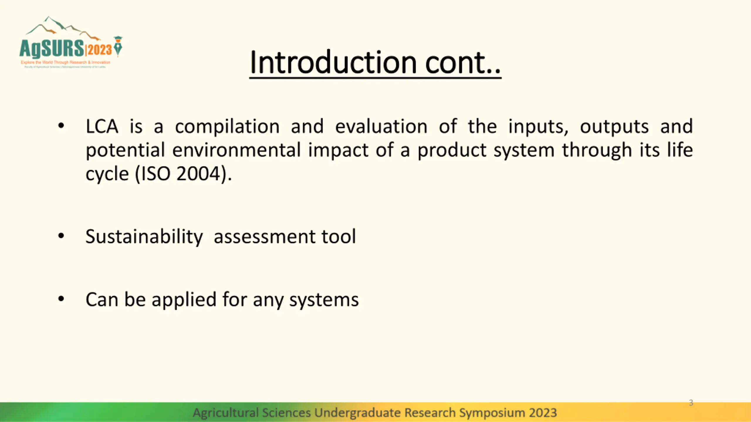 Introduction cont.. Introduction cont.. LCA is a compilation and evaluation of the inputs, outputs and potential environmental impact of a product system through its life cycle (ISO 2004). Sustainability assessment tool Can be applied for any systems 3