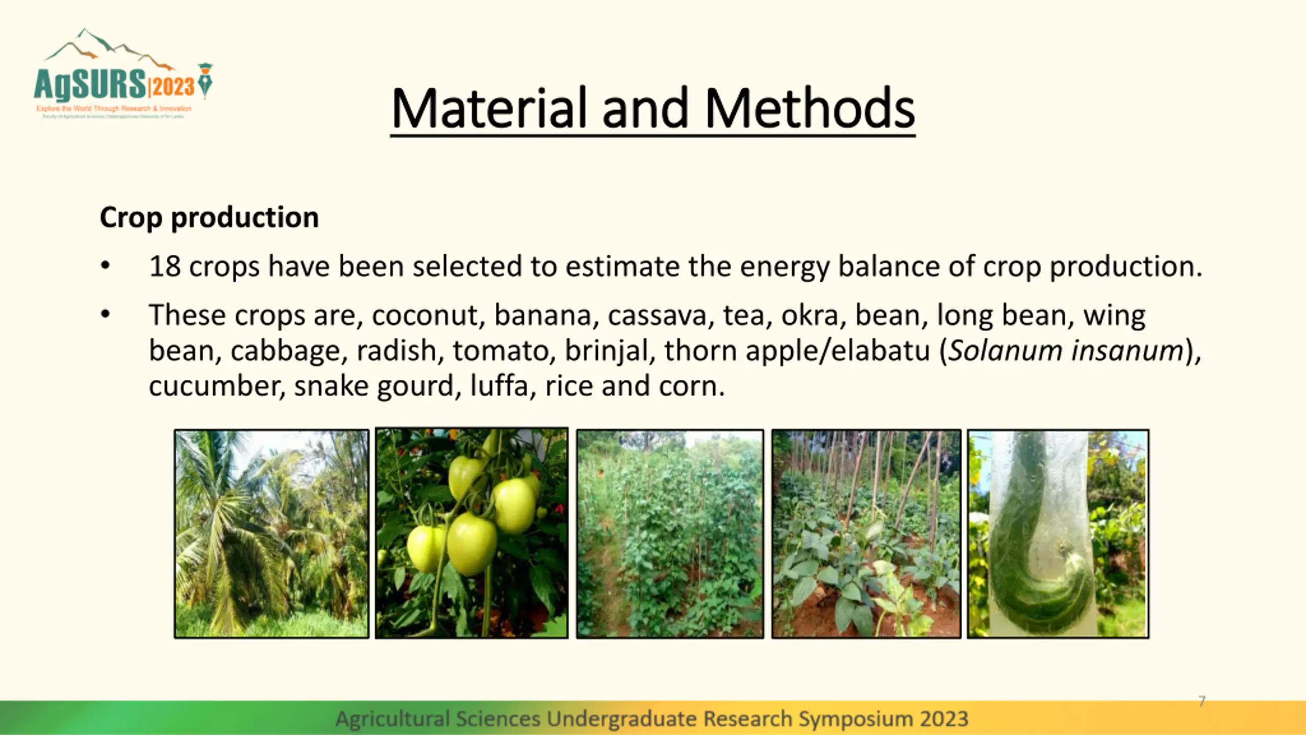 Material and Methods Material and Methods Crop production 18 crops have been selected to estimate the energy balance of crop production. These crops are, coconut, banana, cassava, tea, okra, bean, long bean, wing bean, cabbage, radish, tomato, brinjal, thorn apple/elabatu (Solanum insanum), cucumber, snake gourd, luffa, rice and corn. 7