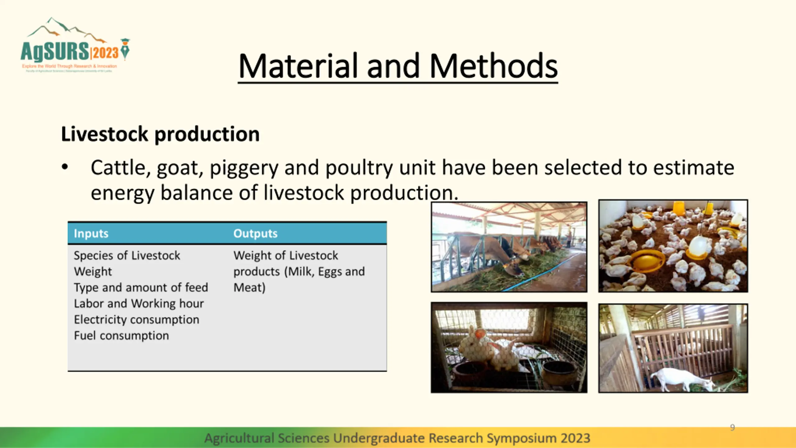 Material and Methods Material and Methods Livestock production Cattle, goat, piggery and poultry unit have been selected to estimate energy balance of livestock production. 9