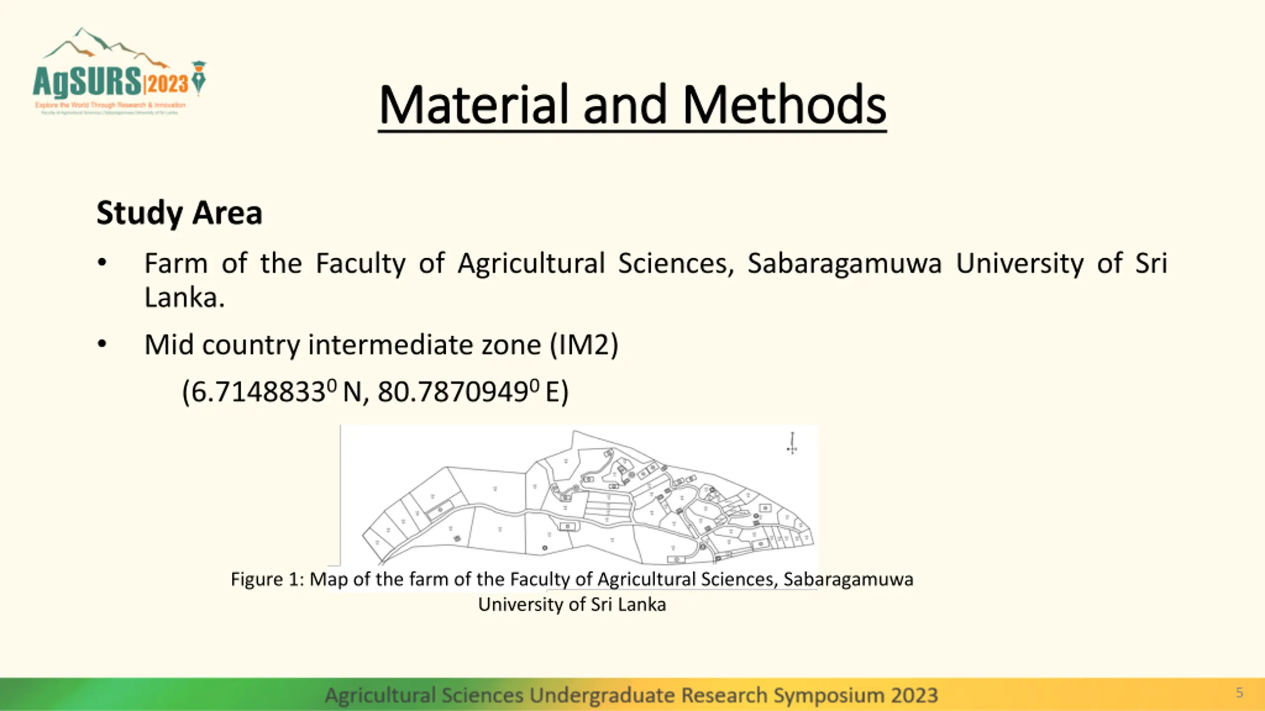 Material and Methods Material and Methods Study Area Farm of the Faculty of Agricultural Sciences, Sabaragamuwa University of Sri Lanka. Mid country intermediate zone (IM2) (6.71488330 N, 80.78709490 E) Figure 1: Map of the farm of the Faculty of Agricultural Sciences, Sabaragamuwa University of Sri Lanka 5