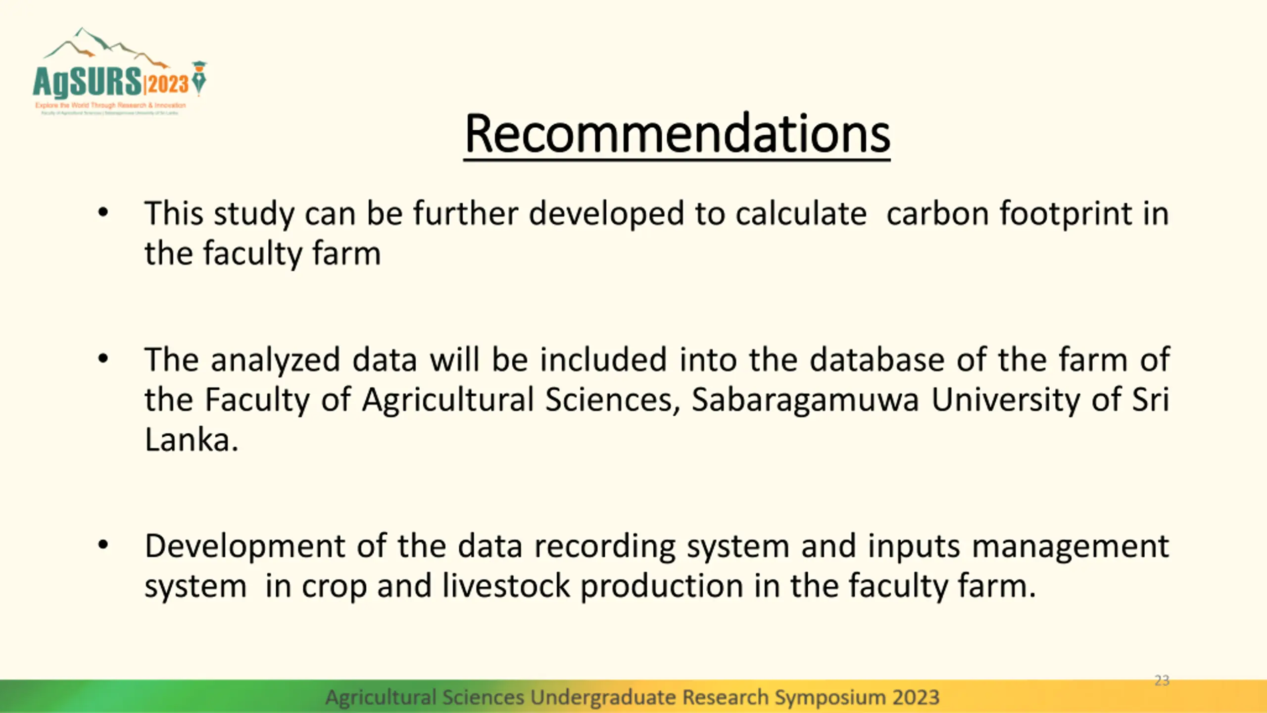 Recommendations Recommendations This study can be further developed to calculate carbon footprint in the faculty farm The analyzed data will be included into the database of the farm of the Faculty of Agricultural Sciences, Sabaragamuwa University of Sri Lanka. Development of the data recording system and inputs management system in crop and livestock production in the faculty farm. 23