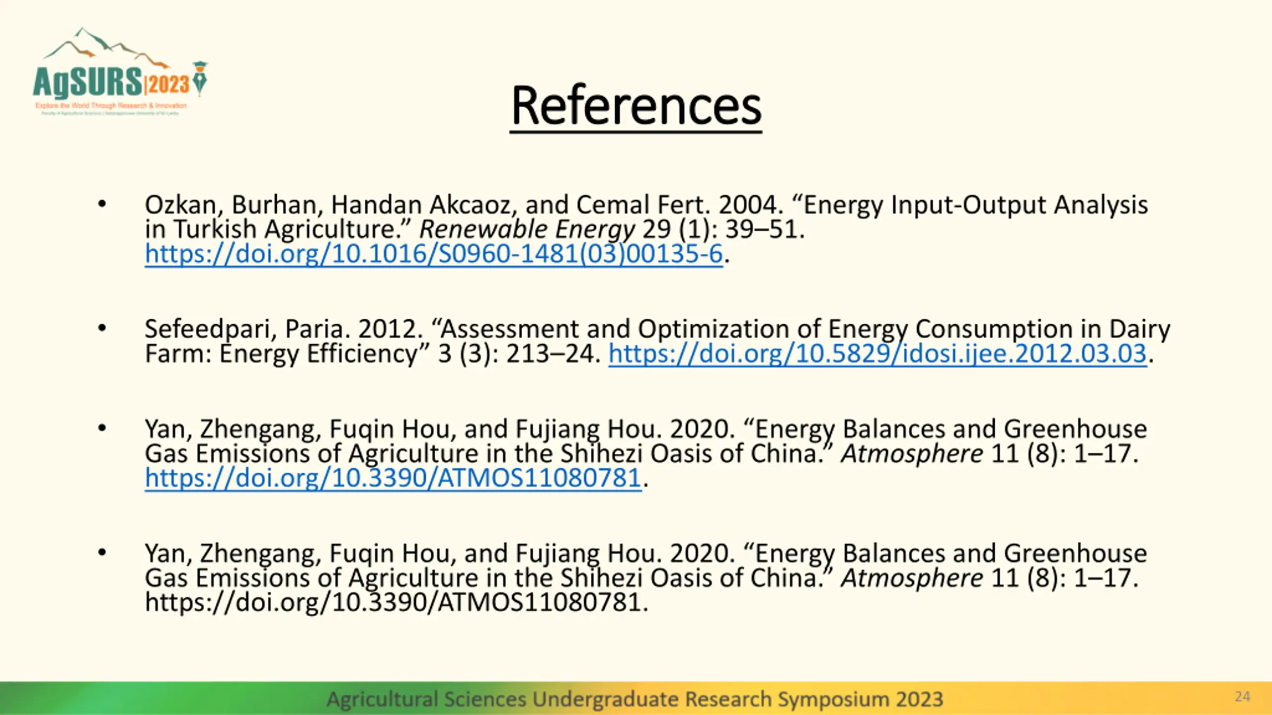 References References Ozkan, Burhan, Handan Akcaoz, and Cemal Fert. 2004. Energy Input-Output Analysis in Turkish Agriculture. Renewable Energy 29 (1): 39 51. https://doi.org/10.1016/S0960-1481(03)00135-6. Sefeedpari, Paria. 2012. Assessment and Optimization of Energy Consumption in Dairy Farm: Energy Efficiency 3 (3): 213 24. https://doi.org/10.5829/idosi.ijee.2012.03.03. Yan, Zhengang, Fuqin Hou, and Fujiang Hou. 2020. Energy Balances and Greenhouse Gas Emissions of Agriculture in the Shihezi Oasis of China. Atmosphere 11 (8): 1 17. https://doi.org/10.3390/ATMOS11080781. Yan, Zhengang, Fuqin Hou, and Fujiang Hou. 2020. Energy Balances and Greenhouse Gas Emissions of Agriculture in the Shihezi Oasis of China. Atmosphere 11 (8): 1 17. https://doi.org/10.3390/ATMOS11080781. 24