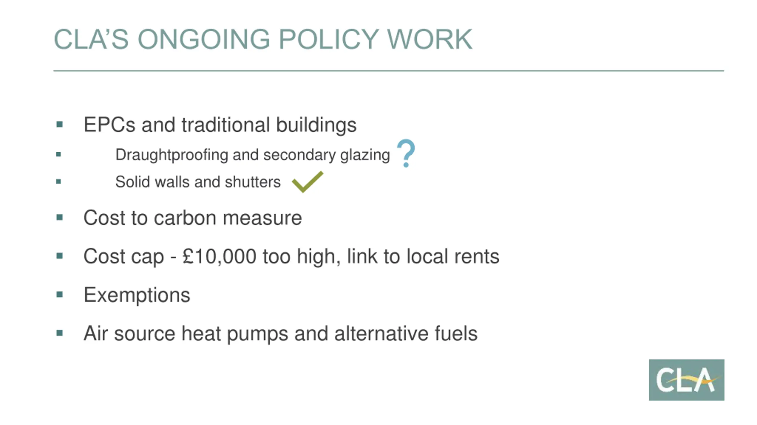 CLAS ONGOING POLICY WORK EPCs and traditional buildings Draughtproofing and secondary glazing Solid walls and shutters Cost to carbon measure Cost cap - 10,000 too high, link to local rents Exemptions Air source heat pumps and alternative fuels