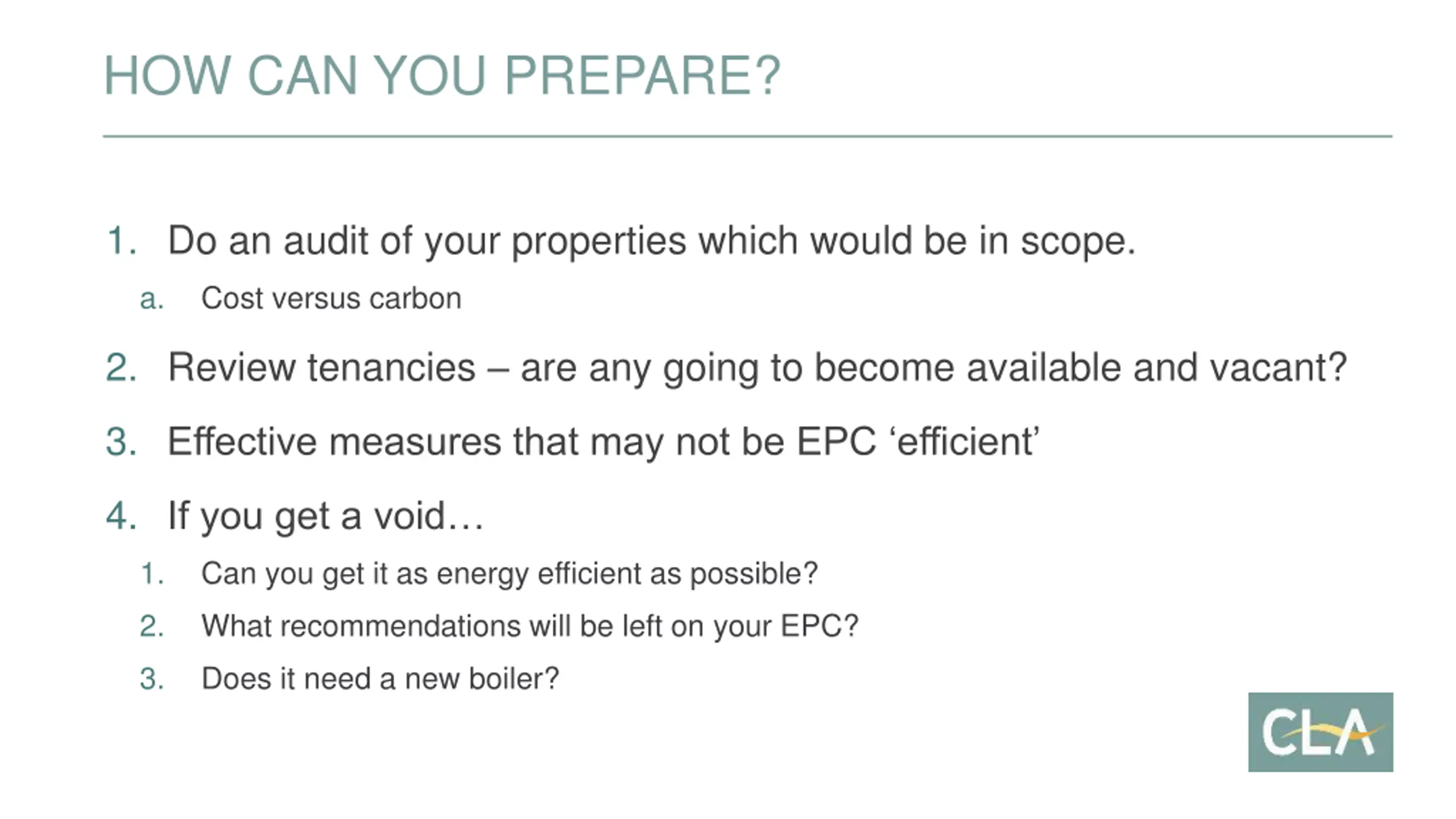 HOW CAN YOU PREPARE? 1. Do an audit of your properties which would be in scope. a. Cost versus carbon 2. Review tenancies are any going to become available and vacant? 3. Effective measures that may not be EPC efficient 4. If you get a void 1. Can you get it as energy efficient as possible? 2. What recommendations will be left on your EPC? 3. Does it need a new boiler?