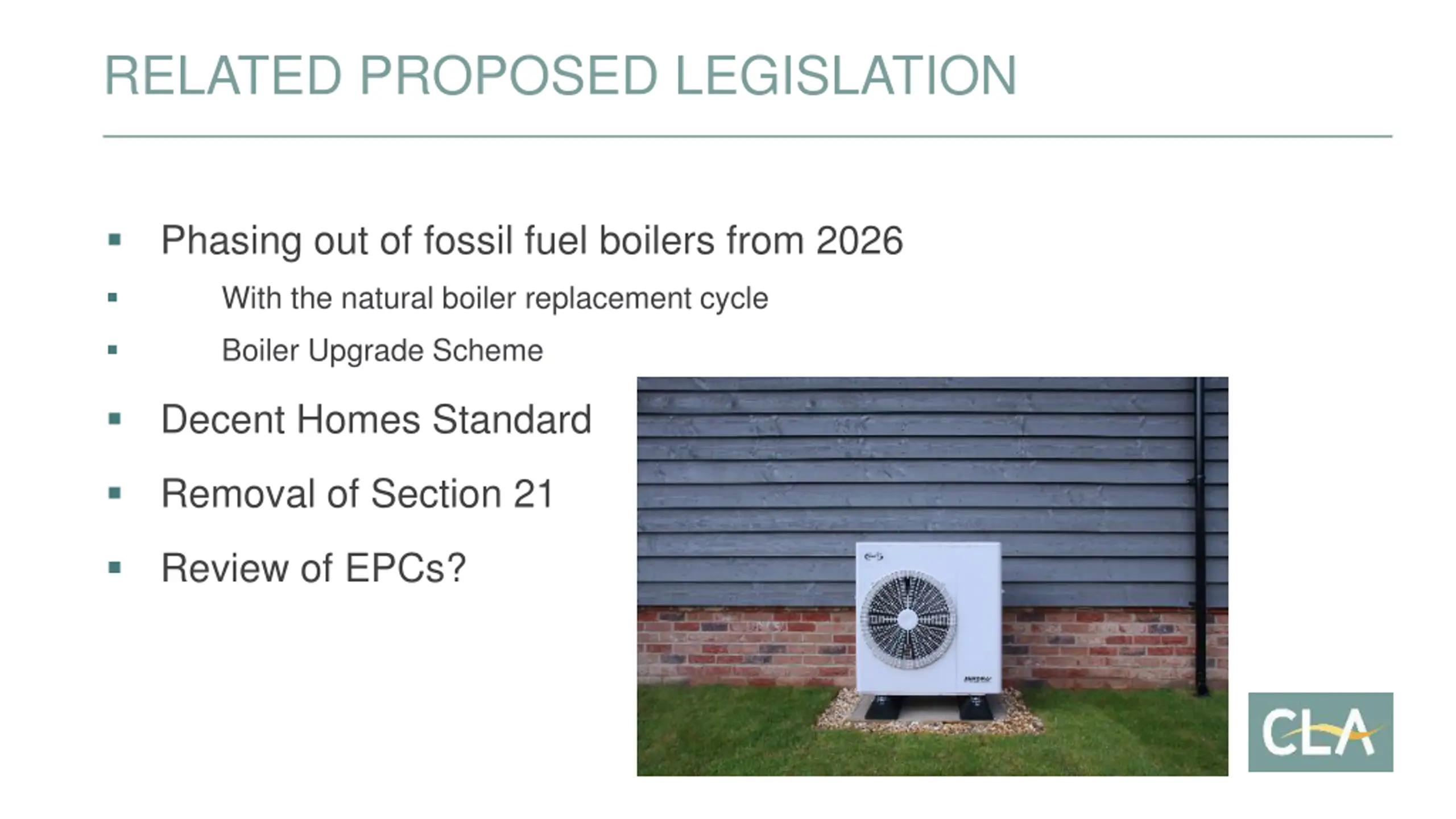 RELATED PROPOSED LEGISLATION Phasing out of fossil fuel boilers from 2026 With the natural boiler replacement cycle Boiler Upgrade Scheme Decent Homes Standard Removal of Section 21 Review of EPCs?