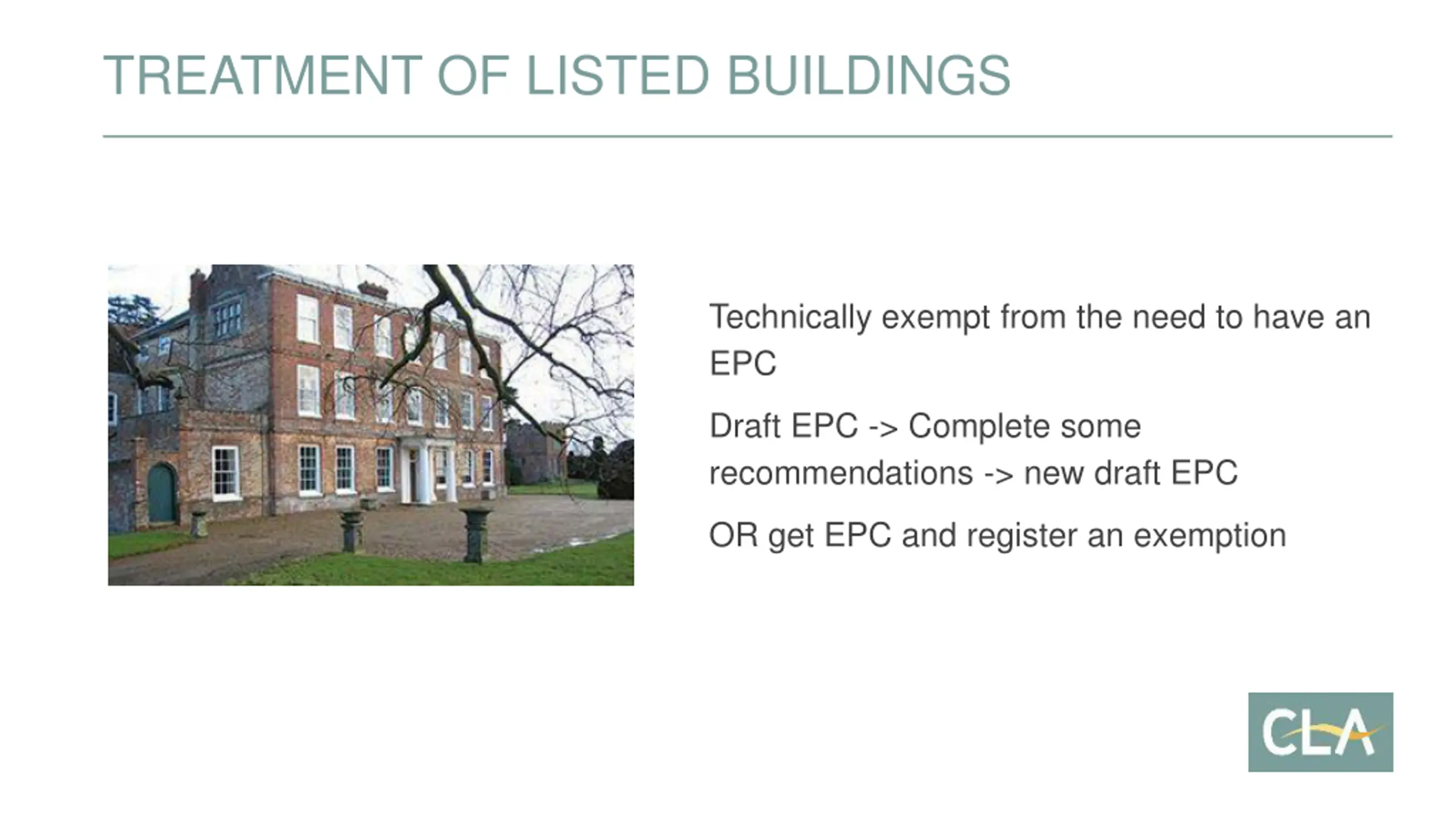 TREATMENT OF LISTED BUILDINGS Technically exempt from the need to have an EPC Draft EPC -> Complete some recommendations -> new draft EPC OR get EPC and register an exemption