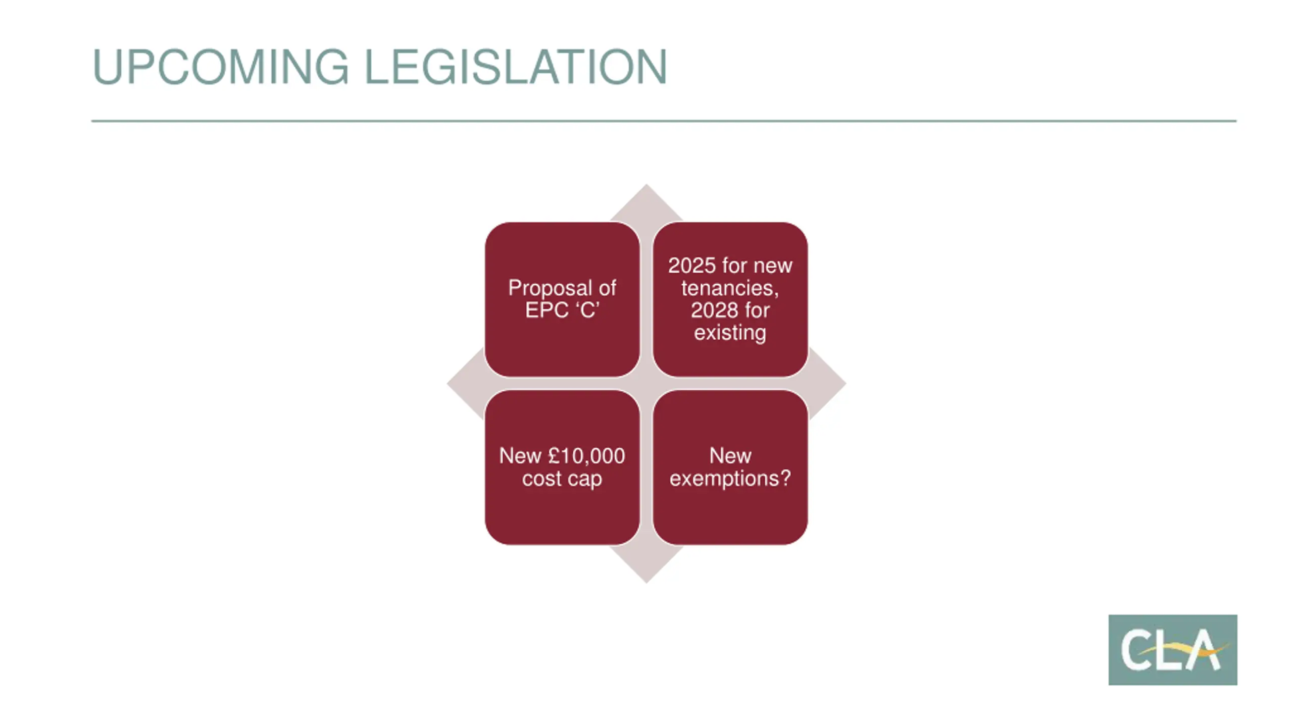 UPCOMING LEGISLATION 2025 for new tenancies, 2028 for existing Proposal of EPC C New 10,000 cost cap New exemptions?