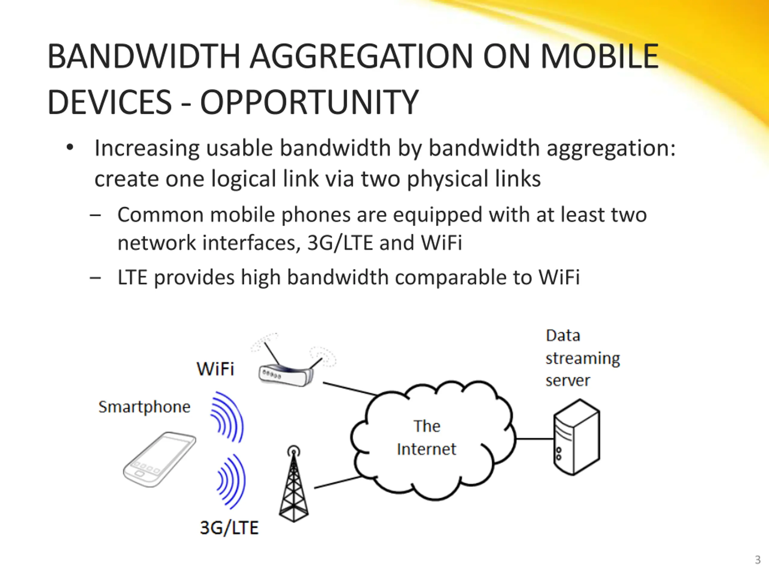 BANDWIDTH AGGREGATION ON MOBILE DEVICES - OPPORTUNITY Increasing usable bandwidth by bandwidth aggregation: create one logical link via two physical links Common mobile phones are equipped with at least two network interfaces, 3G/LTE and WiFi LTE provides high bandwidth comparable to WiFi 3