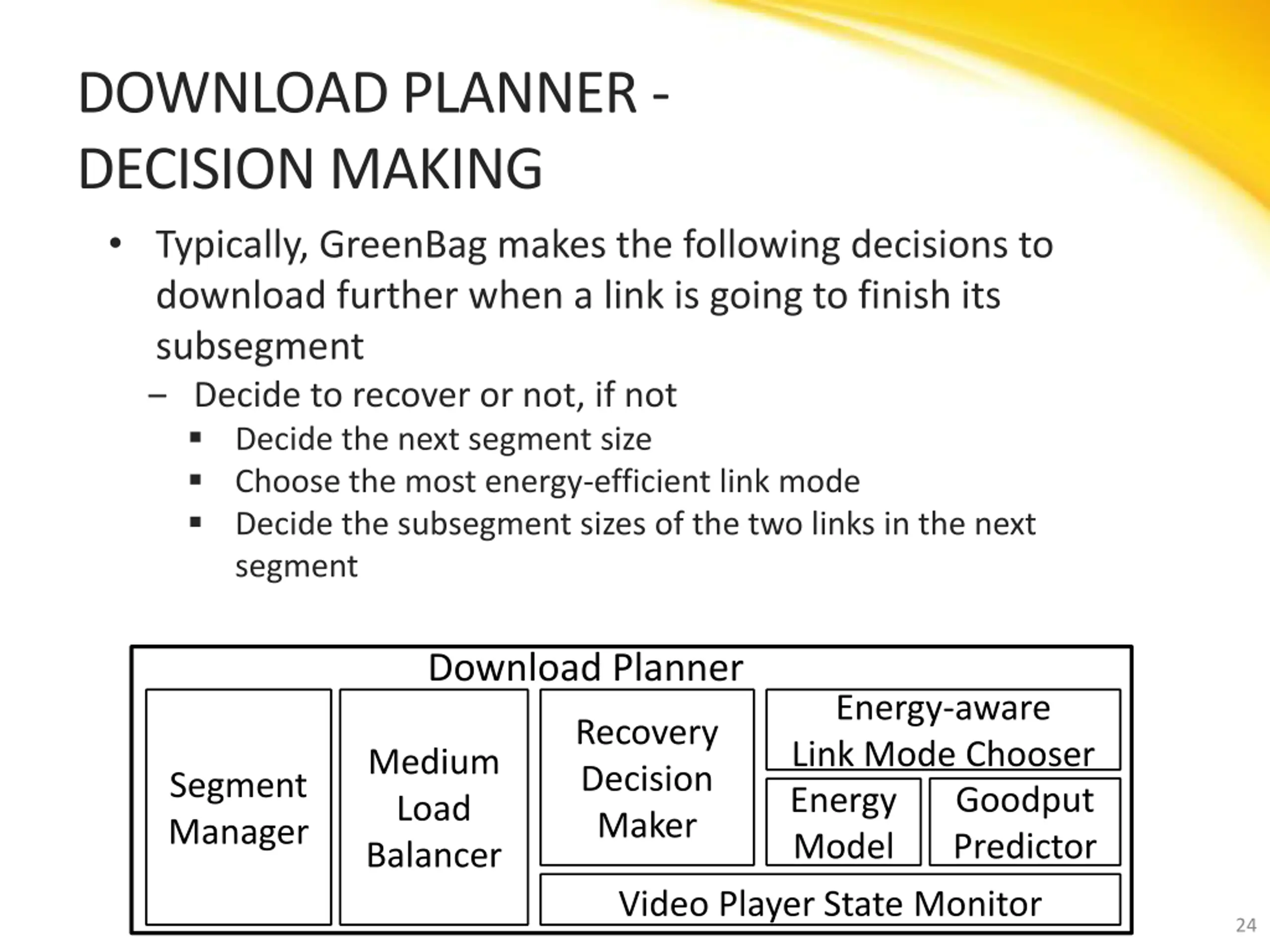 COMPONENTS OF DOWNLOAD PLANNER (5/5) Goodput Predictor Predict goodput of each link in the remaining portion of the file using an exponential weighted moving average (EWMA) predictor Video Player State Monitor Monitor the video player s current state and position Download Planner Energy-aware Link Mode Chooser Recovery Decision Maker Medium Load Balancer Segment Manager Goodput Predictor Energy Model Video Player State Monitor 23