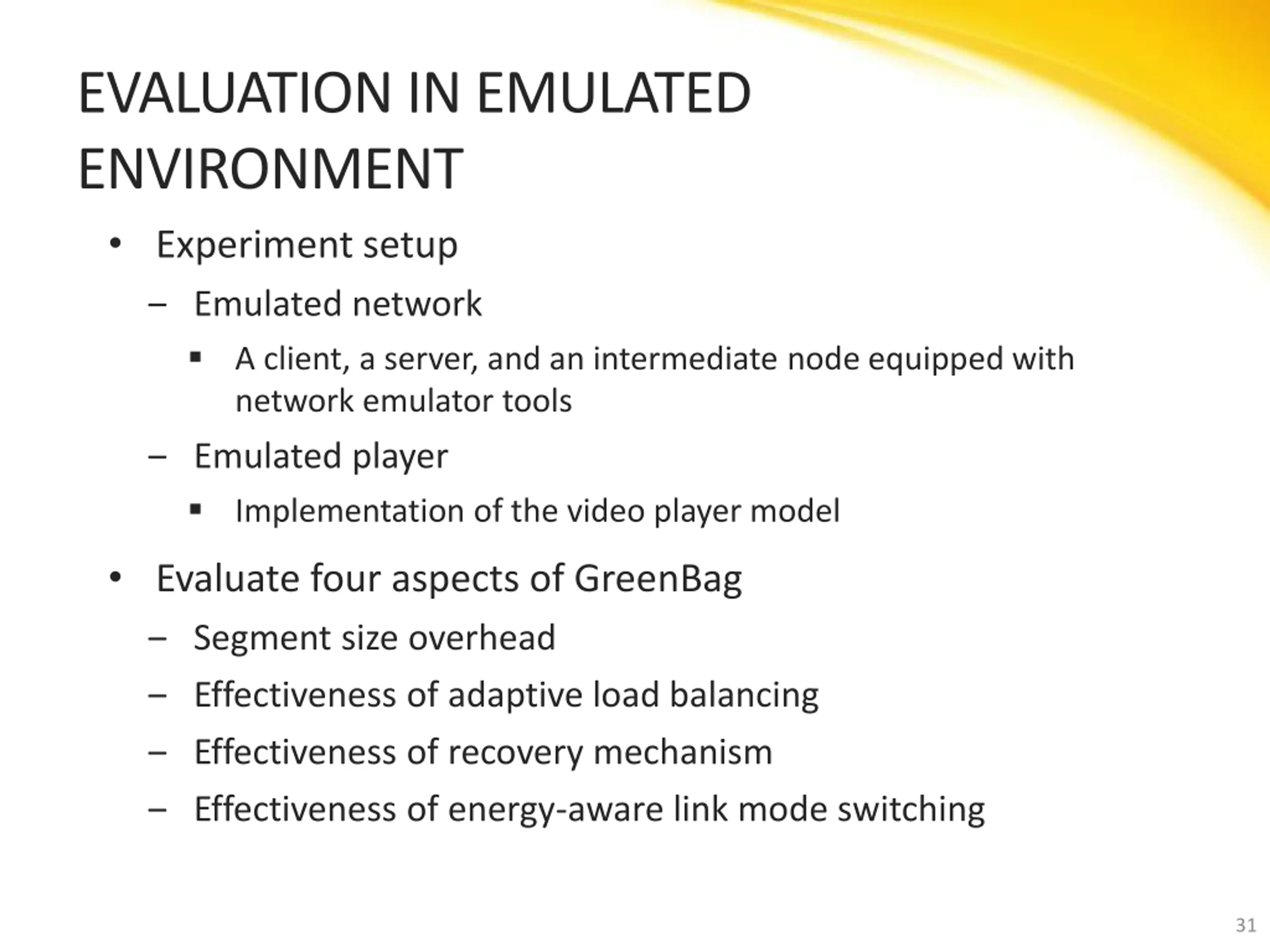 EVALUATION IN EMULATED ENVIRONMENT Experiment setup Emulated network A client, a server, and an intermediate node equipped with network emulator tools Emulated player Implementation of the video player model Evaluate four aspects of GreenBag Segment size overhead Effectiveness of adaptive load balancing Effectiveness of recovery mechanism Effectiveness of energy-aware link mode switching 31