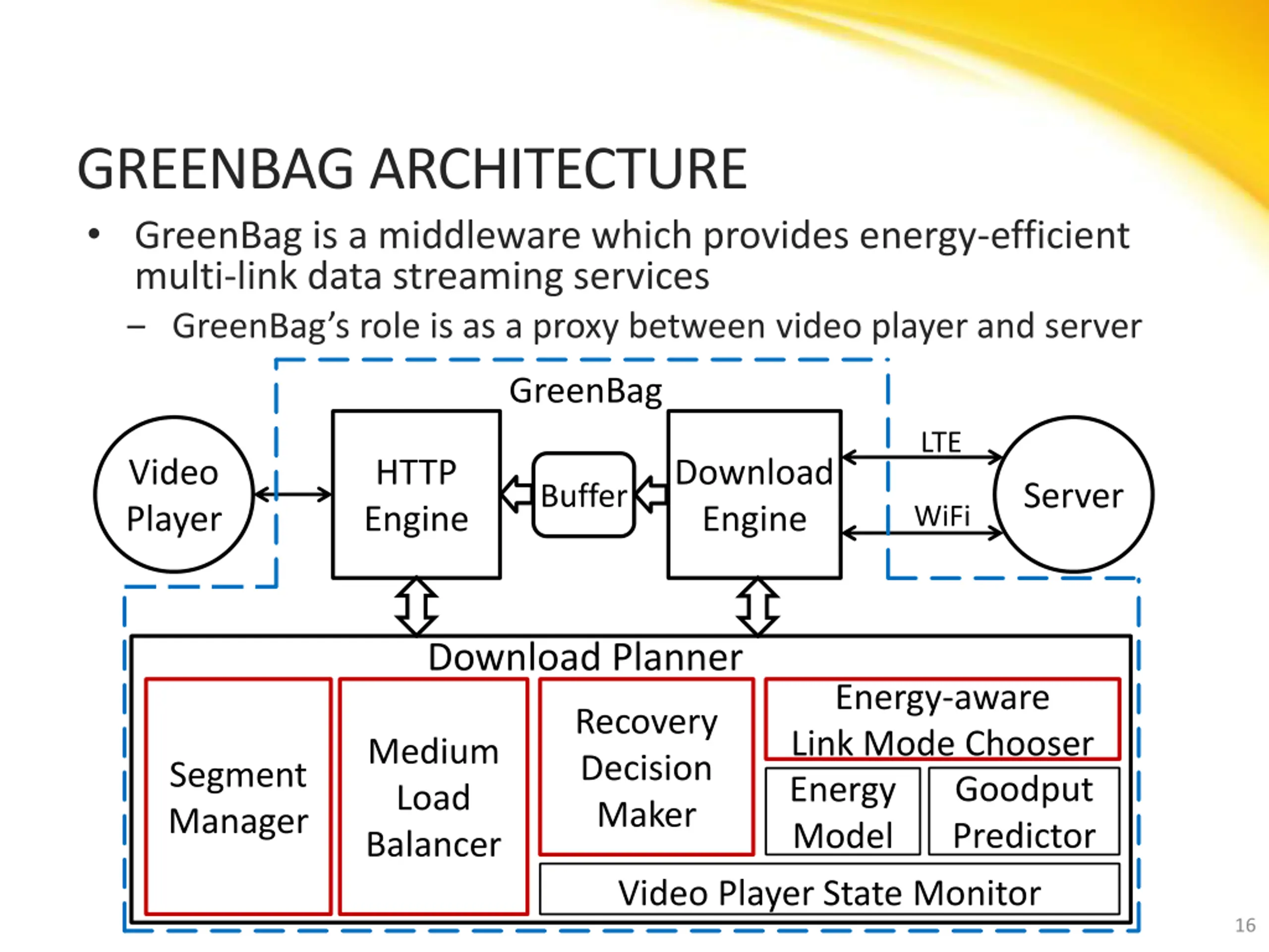 GREENBAG ARCHITECTURE GreenBag is a middleware which provides energy-efficient multi-link data streaming services GreenBag s role is as a proxy between video player and server GreenBag LTE Video Player HTTP Engine Download Engine Server Buffer WiFi Download Planner 15